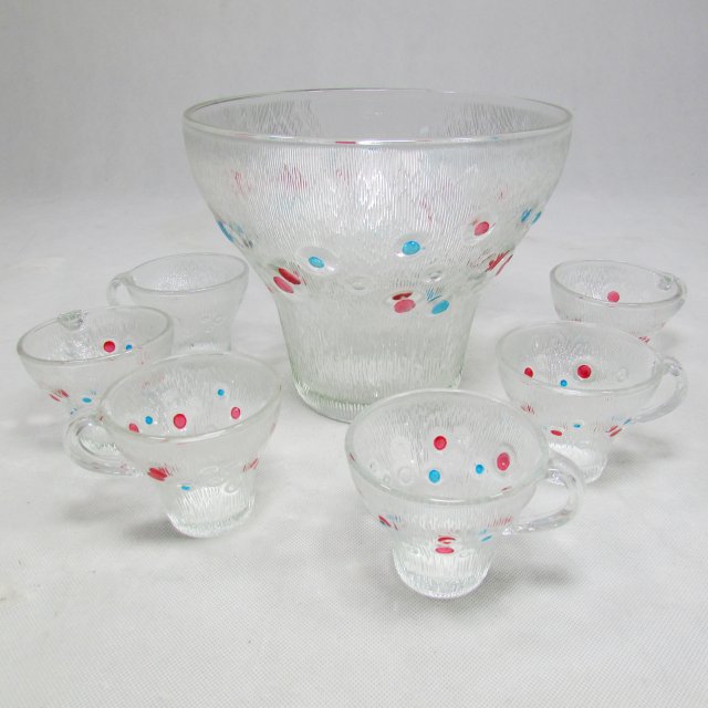 Szklany zestaw do napojów w kolorowe kropki z Huty Szkła w Ząbkowicach, z lat 70. Zestaw jest w idealnym stanie, bez uszkodzeń, ma jedynie miejscowe ubytki farby. Zestaw składa się z dużej misy i sześciu filiżanek