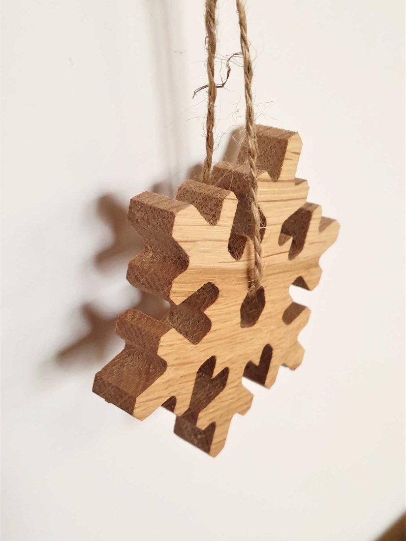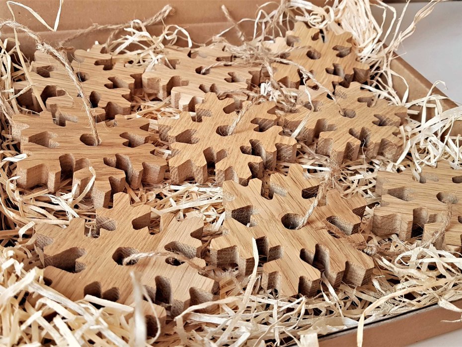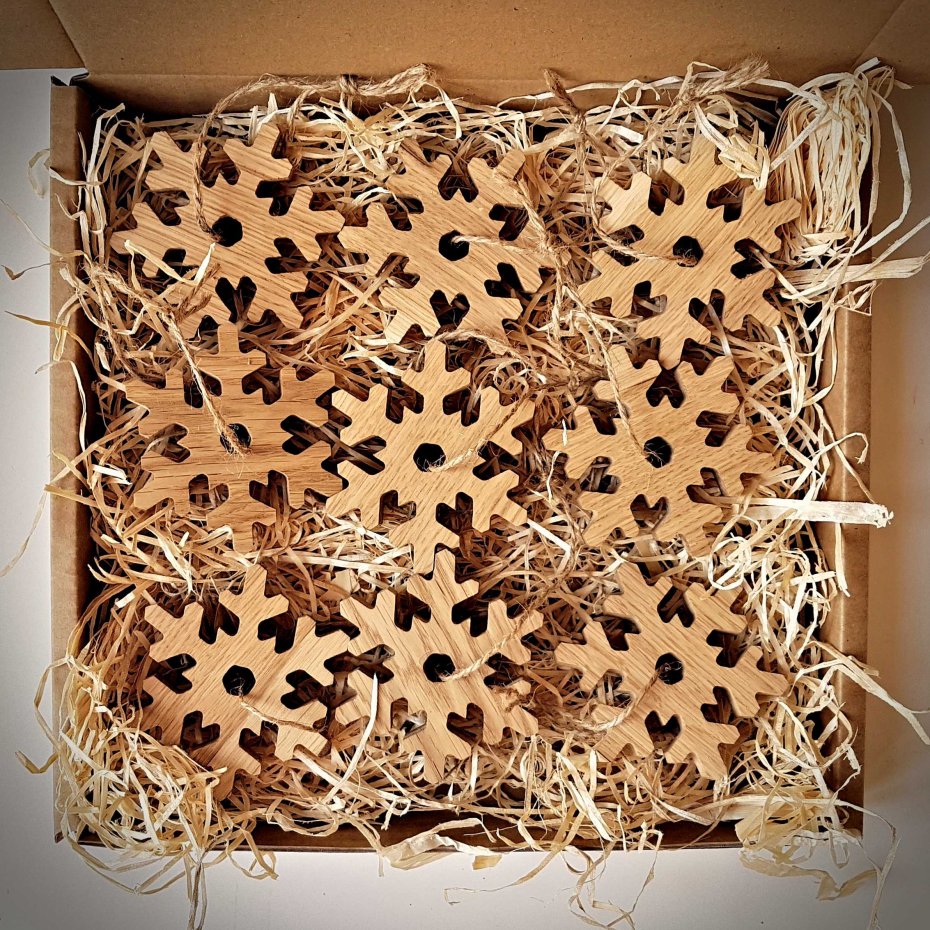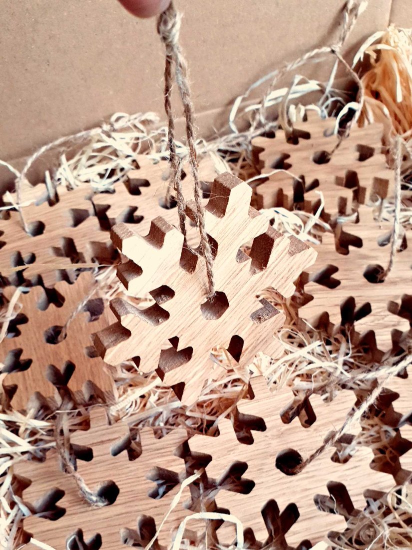 Dekoracje przeznaczone do powieszenia na choinkę wykonane w zgodzie z naturą! Ekologiczne, starannie wykonane drewniane śnieżynki to pomysł na świąteczną ozdobę przyjazną środowisku przy tym niezwykle uroczą i praktyczną. Zestaw ozdób zapakowany w kartonik, to także ciekawa propozycja na świąteczny upominek.