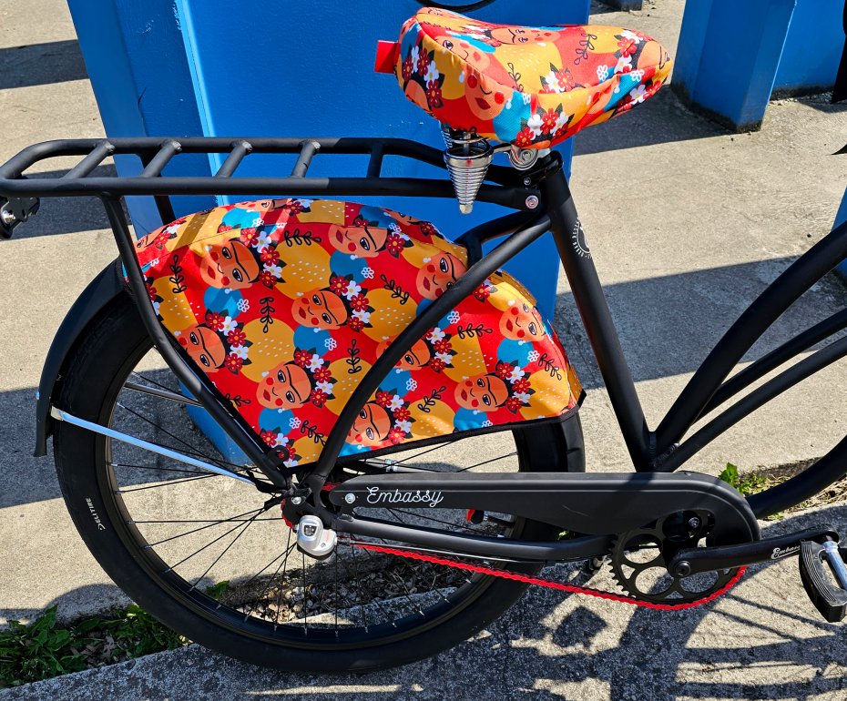 -pokrowce siodełka i rączek z materiału wodoodpornego z printem w multikolorowe twarze fridy z owocami