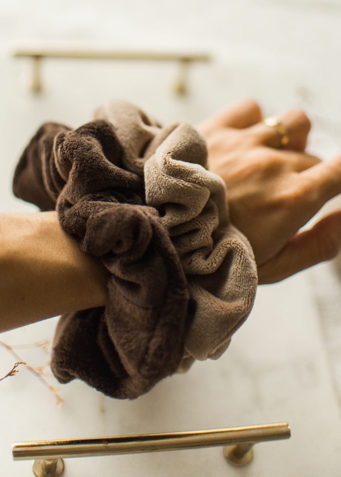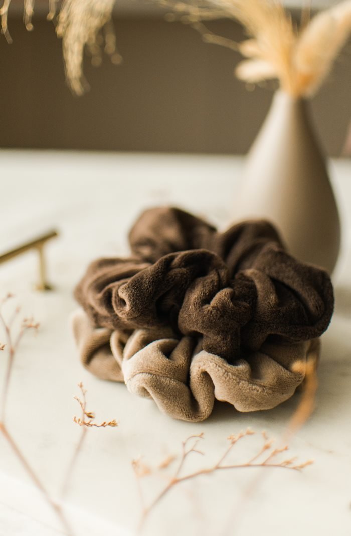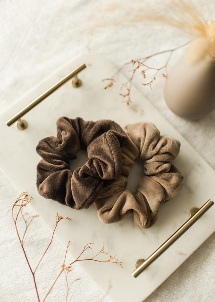 Brązowa i beżowa gumka z welurowego materiału w dwupaku. Miłe w dotyku.