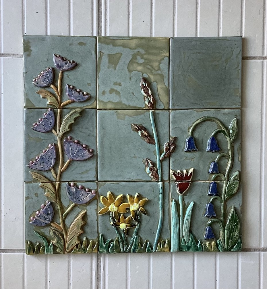 Kafle wykonane ręcznie z jasnej gliny szamotowej. Zestaw składa się z 9 płytek ozdobionych ręcznie formowanymi z gliny roślinami. Kafle poszkliwione satynowym szkliwem w odcieniu miętowej zieleni ze srebrnymi przebarwieniami, a rośliny w różnych kolorach. Zestaw w rozmiarze 37 x 37 cm. Grubość około 6 mm.