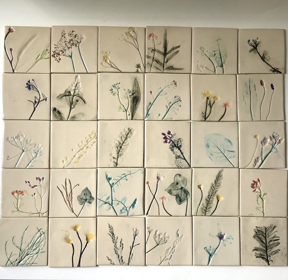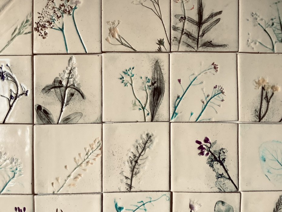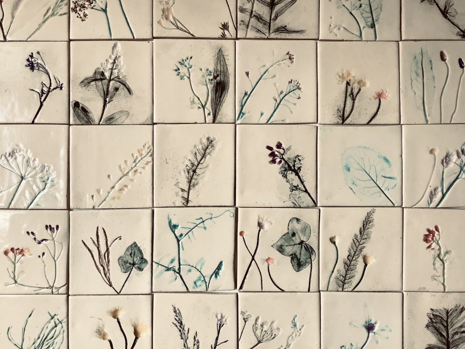Kafle wykonane ręcznie z jasnej gliny szamotowej. Zestaw składa się z 30 płytek ozdobionych odciskami roślin. Zestaw w rozmiarze 60 x 50 cm. Grubość około 6-7 mm. Rośliny zostały poszkliwione na kolorowo, zaś tło jest w naturalnym kolorze gliny i zostało poszkliwione szkliwem transparentnym.