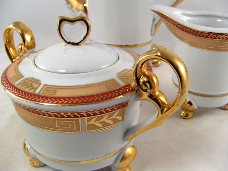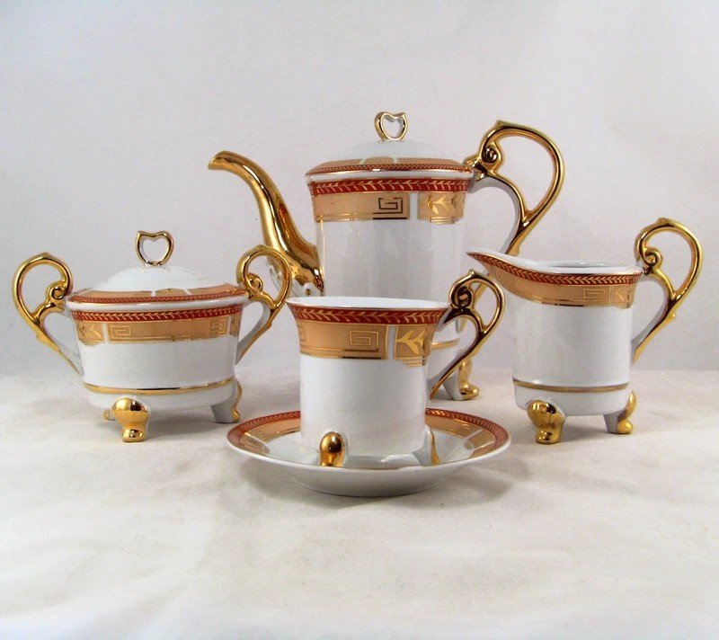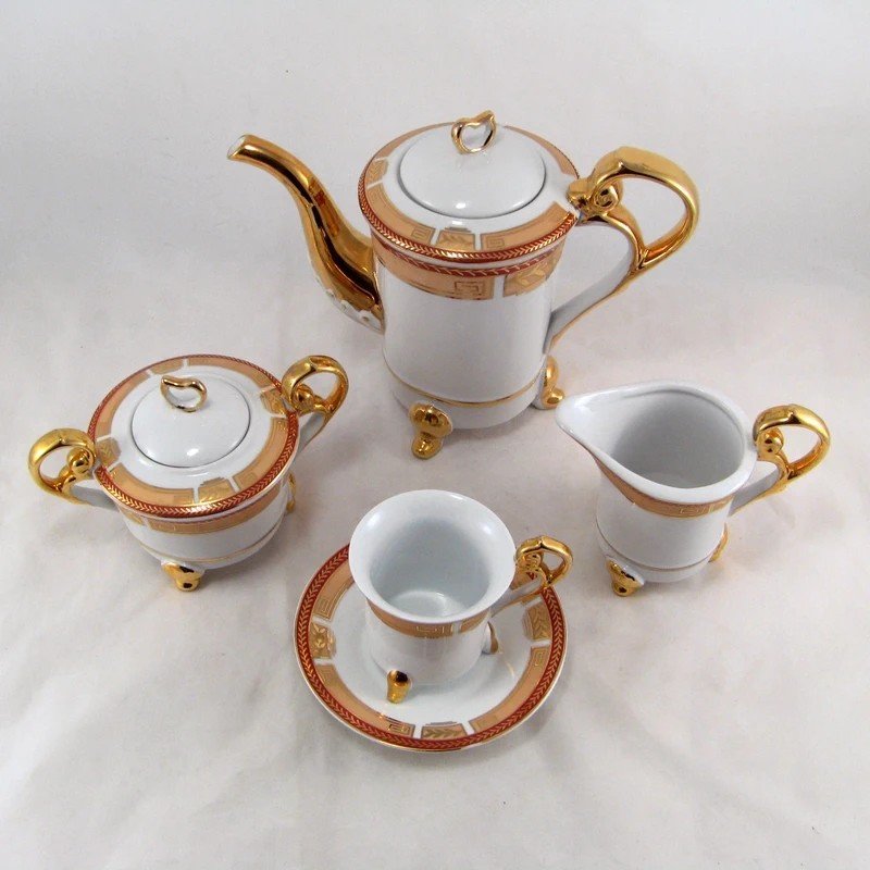 Zestaw kawowy dla jednej osoby. Naczynia na nóżkach zdobione złoceniami. W skład zestawu wchodzi: dzbanek, cukiernica mlecznik oraz filiżanka z podstawkiem. Stan zachowania bardzo dobry, bez uszkodzeń, bez przetarć.
