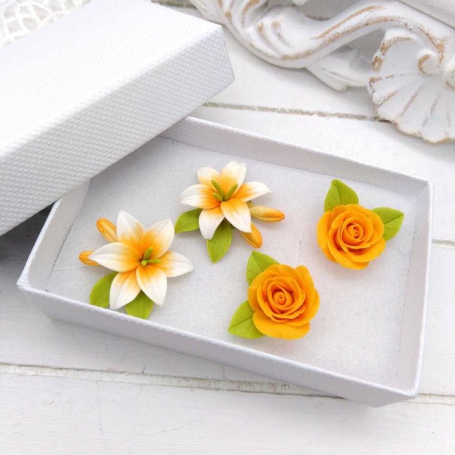 Ten zestaw składa się z dwóch par kolczyków. Kolczyki mają bazę wykonaną ze stali nierdzewnej. Kwiaty są wykonane z wysokiej jakości termoutwardzalnej gliny polimerowej. Zestaw zapakowany w elegancką pudełko.