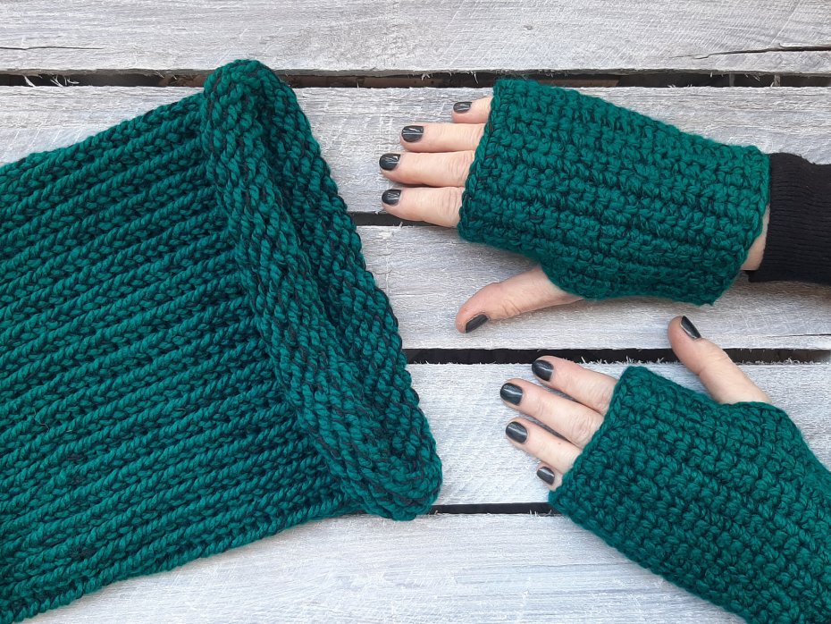 Przyjemny i ciepły komplet na zimę. Komin wykonany na obręczy dziewiarskiej i rękawiczki - mitenki wydziergane na szydełku. Całość zrobiona z włóczki akrylowej z domieszką wełny. Prać ręcznie w 40 st.