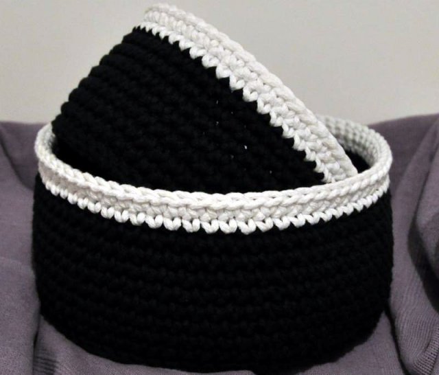 Zestaw dwóch koszyków ze sznurka bawełnianego 5mm w kolorze czarnym z białym wykończeniem.