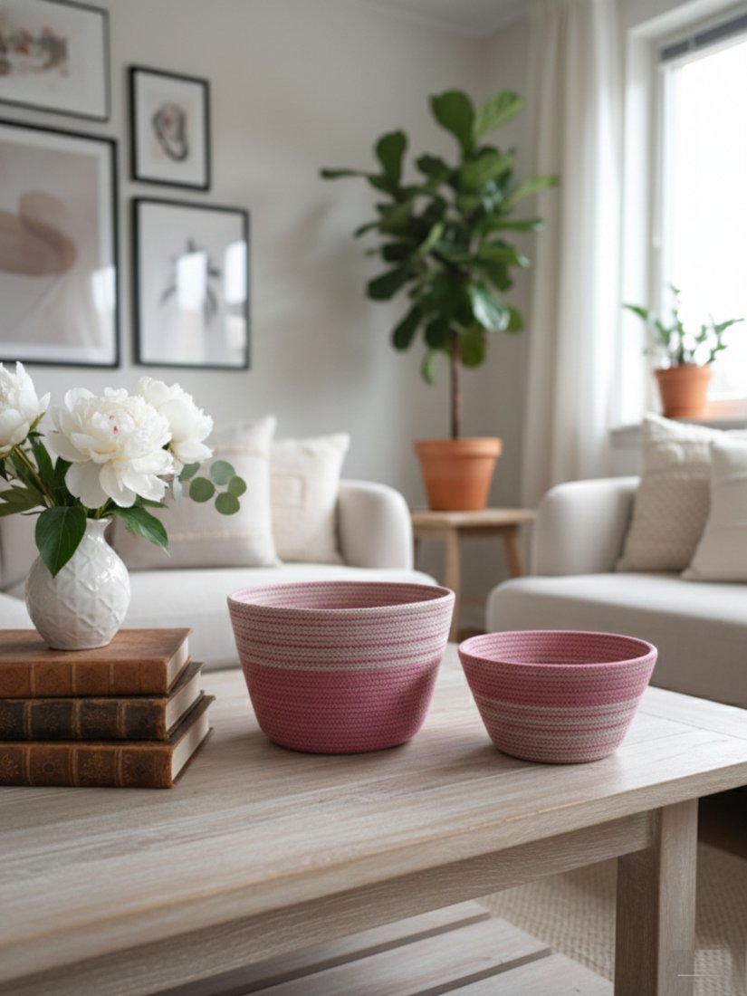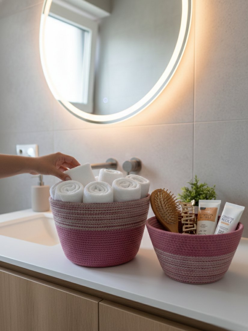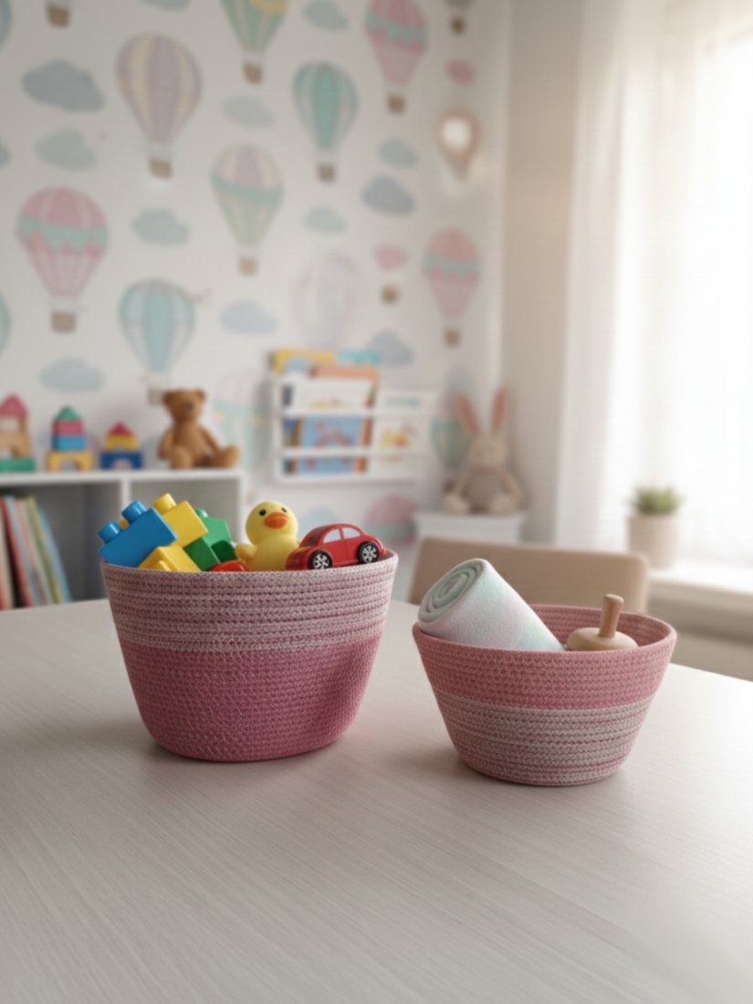 Zestaw koszyków "Różany Spokój" to połączenie elegancji, funkcjonalności i prawdziwego polskiego rękodzieła. Uszyte na maszynie ze sztywnego, bawełnianego sznurka w odcieniu brudnego różu oraz melanżu. Tworzą harmonijną kompozycję, która od razu ociepla każde wnętrze. Dzięki starannemu szyciu i precyzyjnemu prowadzeniu sznurka koszyki zachowują stabilną formę, jednocześnie prezentując się lekko i subtelnie.
