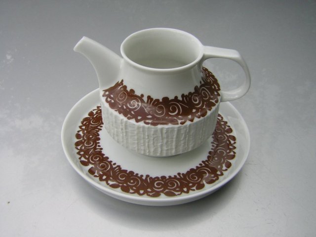 Wyjątkowa to rzecz pochodząca z kultowych lat 70-ych. Jakościowa Porcelana sygnowana jakością THOMAS GERMANY i numerycznie; Dzbanek nr.40, Podstawek - nr. 63. Manufaktura Thomas należy do Grupy Rosenthal. Ciekawy i nie spotykany kształt. Zdobienie - brązowy wzór, oraz bardzo ciekawe matowe-biskwitowe, nieregularne zdobienie boku. Całość na błyszcząco szkliwiona. Nowoczesne pomimo upływu lat, szczególnie w tak dobrym stanie zachowania.