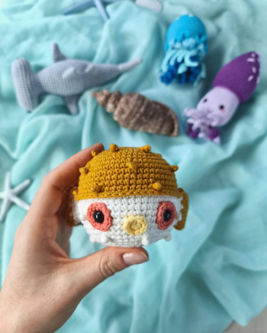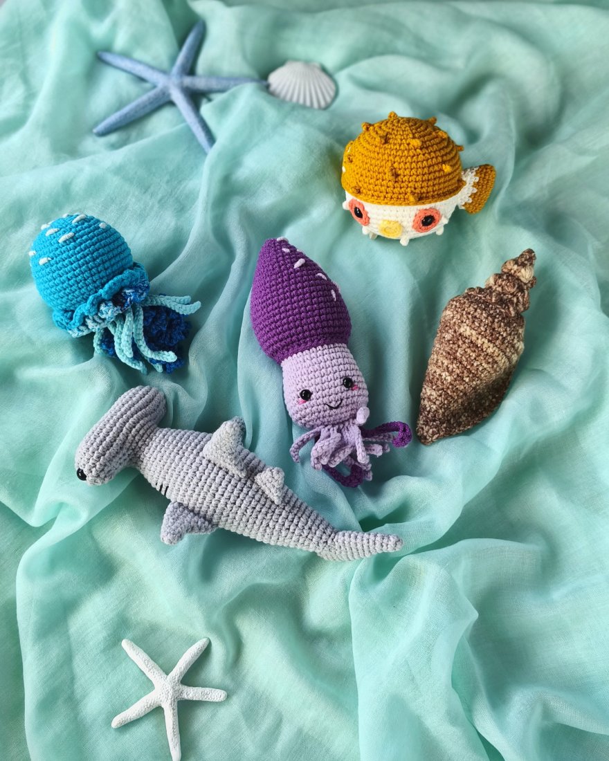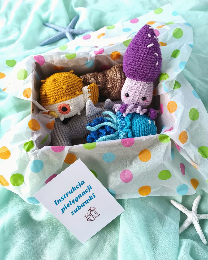 Morskie zwierzęta nie są zbyt małe, co sprawia, że są bardziej zauważalne i mniej prawdopodobne, że zgubią się w dziecięcym pokoju. Zwierzęta wykonane są z wysokiej jakości włóczki półbawełnianej (55% bawełny, 45% akrylu).