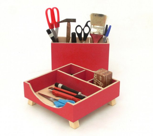 Zestaw dwóch pojemników do organizacji biurka. W całości wykonany ze sklejki drewnianej i pomalowany farbami akrylowymi. Zestaw można skomponować z zegarami.