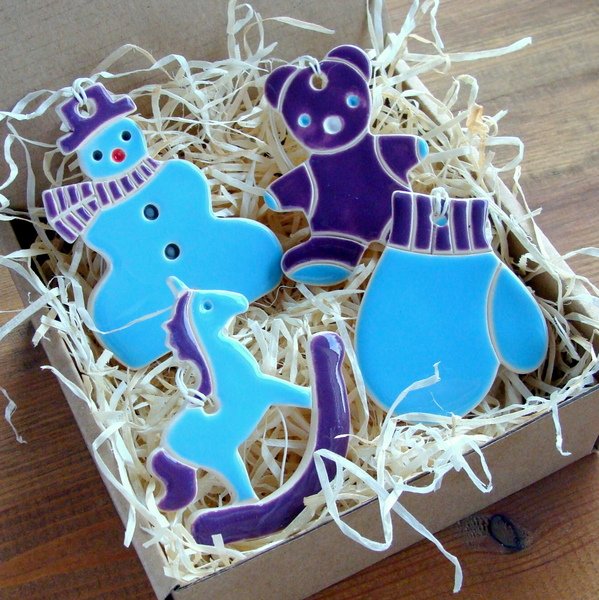 Zestaw 4 ceramicznych ozdób choinkowych. Każda zawieszka posiada lniany, biały sznureczek. Zestaw zapakowany w tekturowe pudełko wyściełane siankiem drzewnym i przyozdobione ceramiczną zawieszką, przez co idealnie nadaje się na prezent. Wymiary zawieszek - ok. 6 do 7 cm. Polecam.