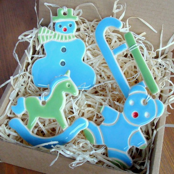 Zestaw 4 ceramicznych ozdób choinkowych. Każda zawieszka posiada lniany, biały sznureczek. Zestaw zapakowany w tekturowe pudełko wyściełane siankiem drzewnym i przyozdobione ceramiczną zawieszką, przez co idealnie nadaje się na prezent. Wymiary zawieszek - ok. 6 do 7 cm. Polecam.