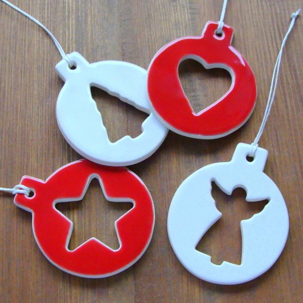 Zestaw 4 ceramicznych ozdób choinkowych. Każda zawieszka posiada lniany, biały sznureczek. Zestaw zapakowany w tekturowe pudełko wyściełane siankiem drzewnym, przez co idealnie nadaje się na prezent. Wymiary zawieszek - ok. 6,5 x 5,5 cm. Polecam.
