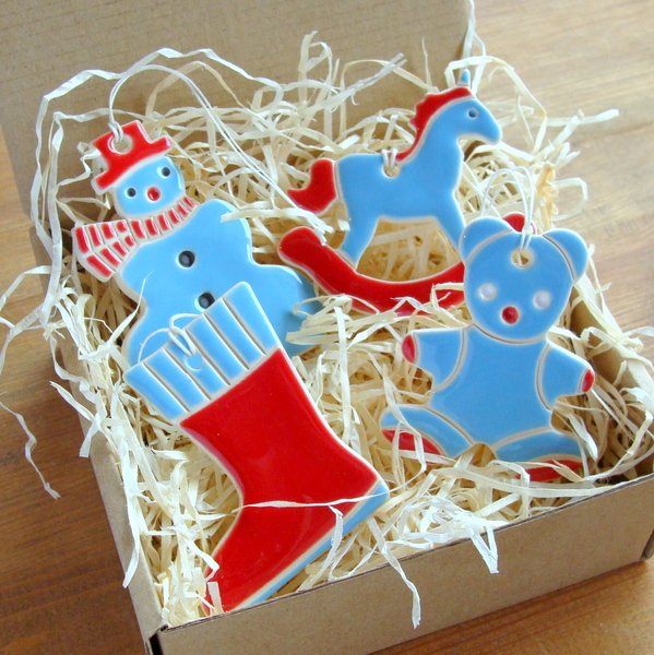 Zestaw 4 ceramicznych ozdób choinkowych. Każda zawieszka posiada lniany, biały sznureczek. Zestaw zapakowany w tekturowe pudełko wyściełane siankiem drzewnym i przyozdobione ceramiczną zawieszką, przez co idealnie nadaje się na prezent. Wymiary zawieszek - ok. 6 do 7 cm. Polecam.