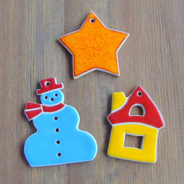 Zestaw 3 ceramicznych ozdób choinkowych. Każda zawieszka posiada lniany, biały sznureczek. Zestaw zapakowany w tekturowe pudełko wyściełane siankiem drzewnym i przyozdobione ceramiczną zawieszką, przez co idealnie nadaje się na prezent. Wymiary zawieszek - ok. 6 do 7 cm. Polecam.