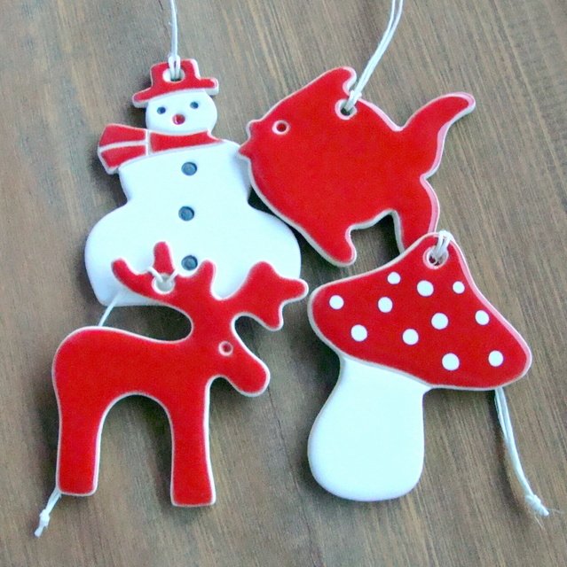 Zestaw 4 ceramicznych ozdób choinkowych. Każda zawieszka posiada lniany, biały sznureczek. Zestaw zapakowany w tekturowe pudełko wyściełane siankiem drzewnym i przyozdobione ceramiczną zawieszką, przez co idealnie nadaje się na prezent. Wymiary zawieszek - ok. 6 do 7 cm. Polecam.