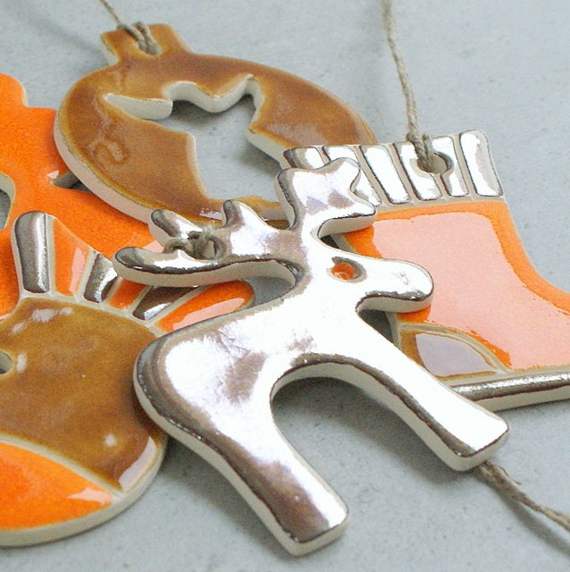 Zestaw 5 ceramicznych zawieszek, bardzo błyszczących. Pokryte szkliwami w kolorach pomarańczowym, starego złota i miodowym. Wymiary ok. 6 - 7 cm. Przepiękna ozdoba choinki, stroika albo paczki z prezentem. Ozdobnie opakowane w pudełko, wyściełane siankiem drzewnym i przyozdobione ceramiczną ozdobą. Polecam.