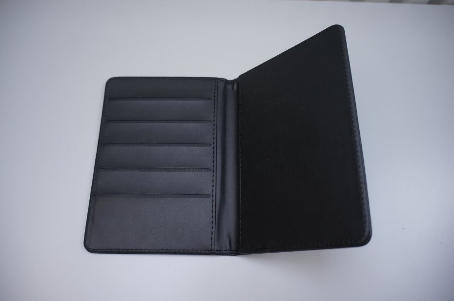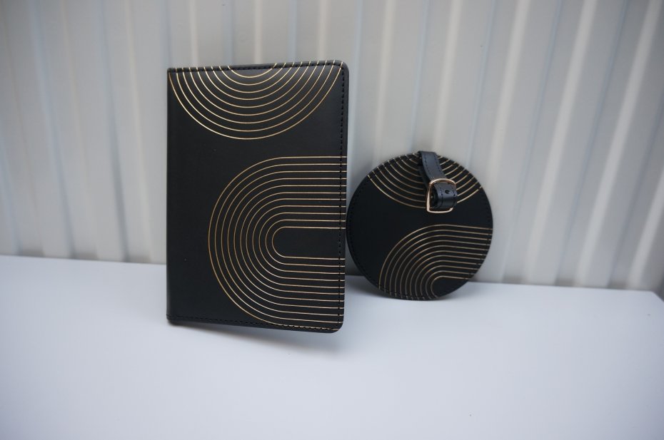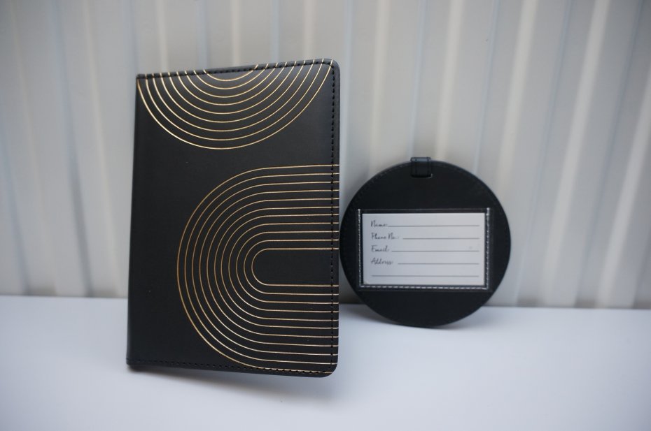 Czarny, elegancki zestaw podróżny z ekoskóry ze złotymi, geometrycznymi zdobieniami. Zestaw składa się z etui na paszport i karty płatnicze oraz zawieszki do bagażu. Przedmiot nowy, nigdy nie używany. Stan BARDZO DOBRY minus (brak opakowania).