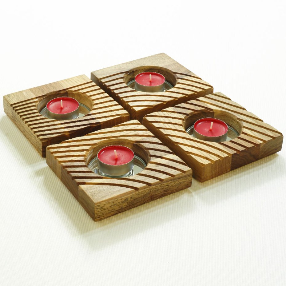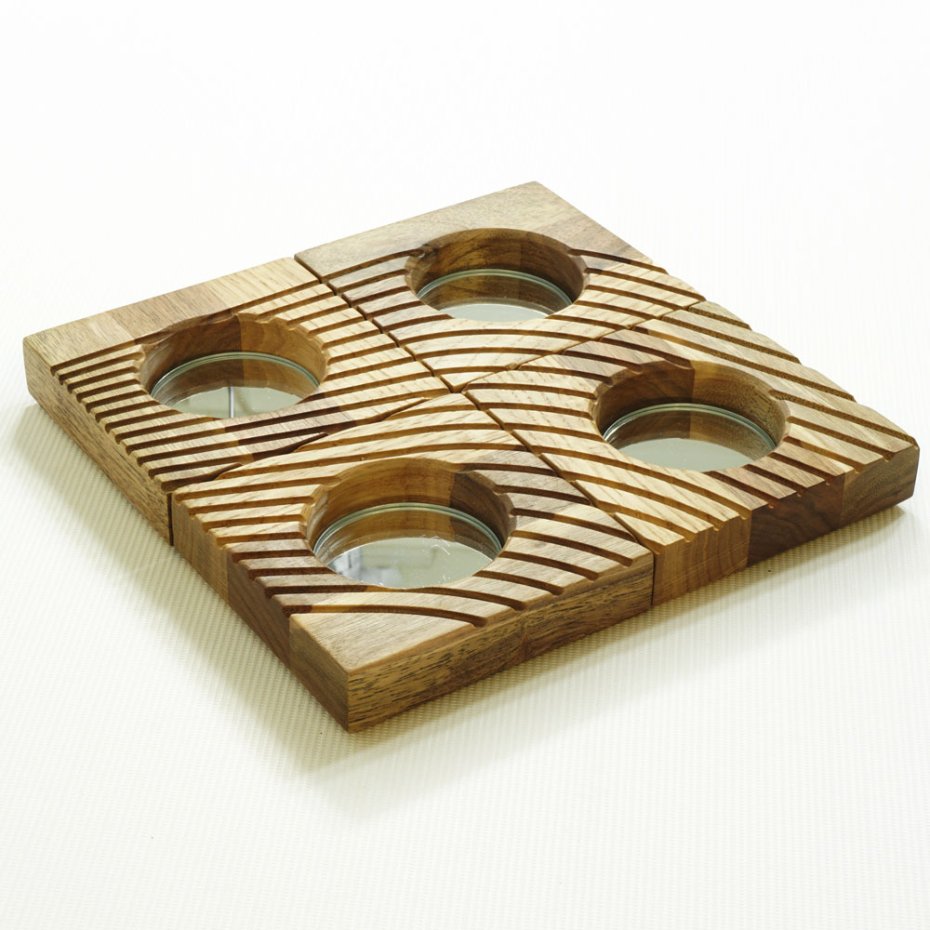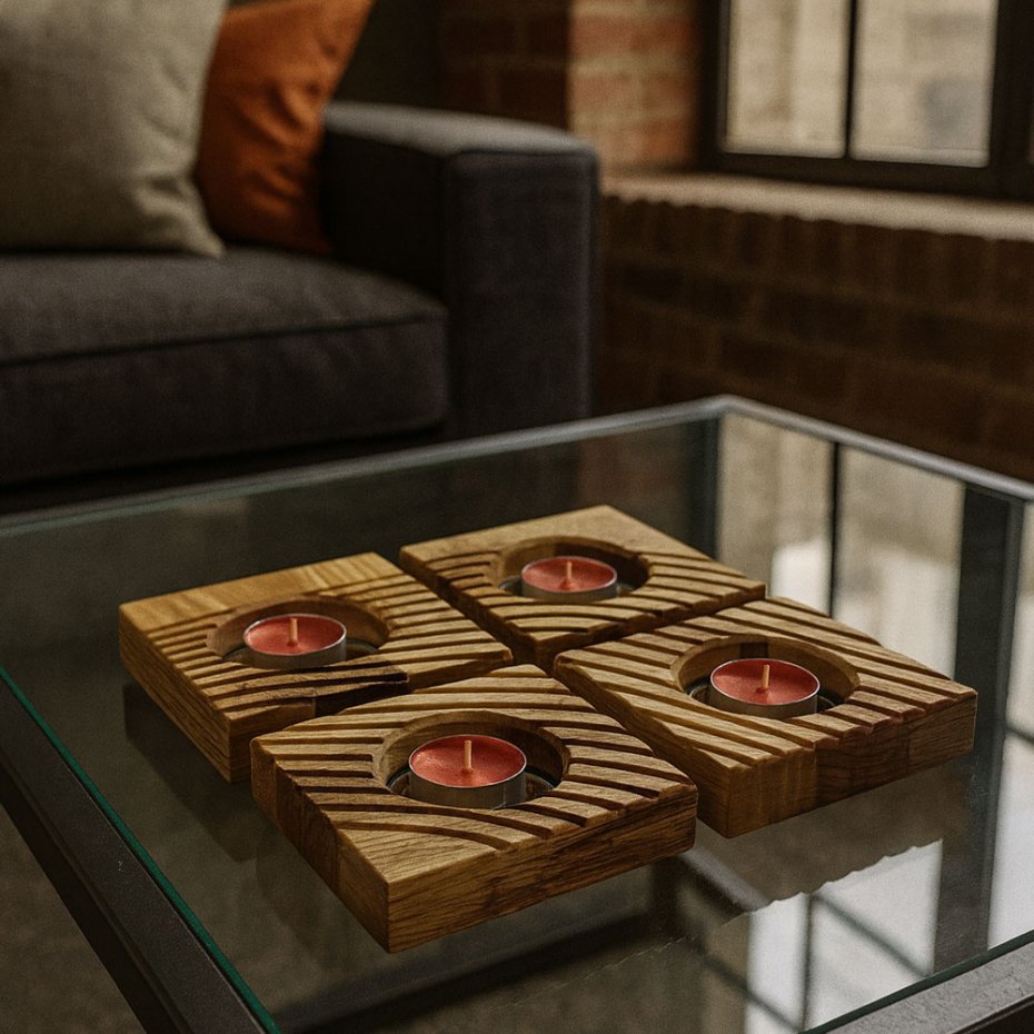 Centralne zagłębienia z lustrem odbijają światło świec i wzmacniają efekt przestrzeni. Płomień zostaje powielony i osadzony głębiej – dzięki czemu światło nie tylko świeci, ale pracuje z formą.