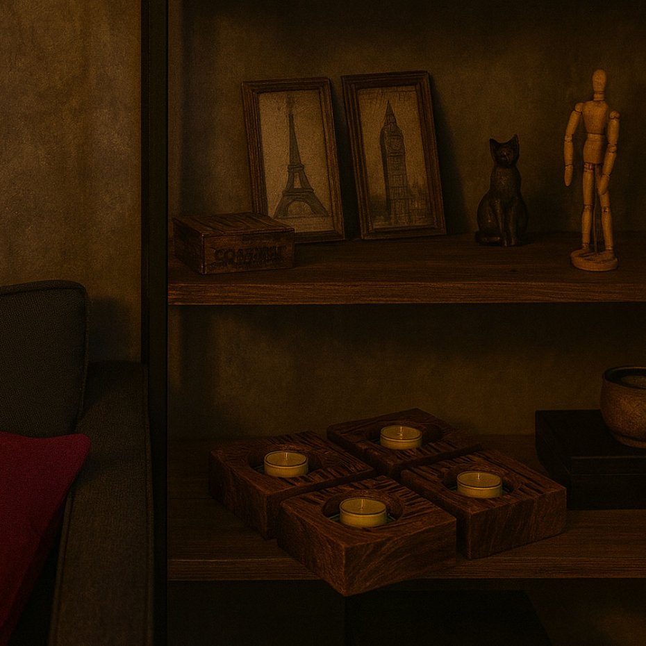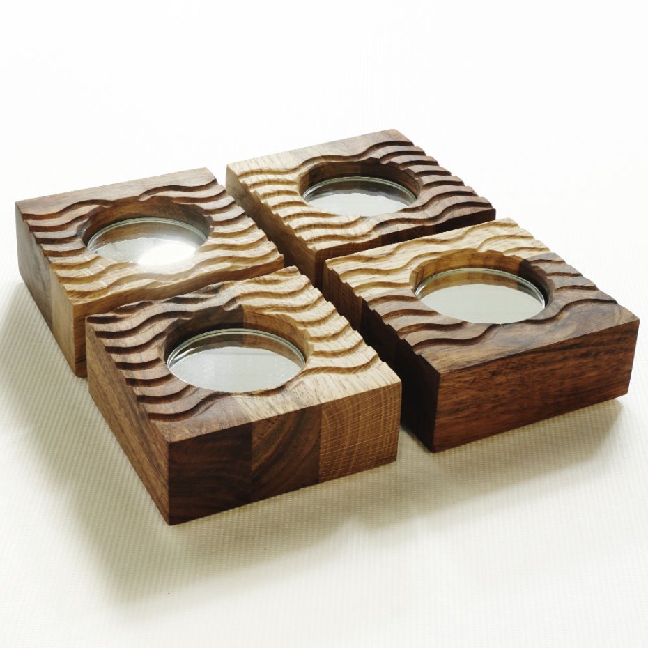 W centralnej części każdego modułu znajduje się zagłębienie z lustrem i wkładem szklanym. Odbicie płomienia wzmacnia światło i nadaje mu dodatkową głębię – jakby było osadzone w kolejnej warstwie.