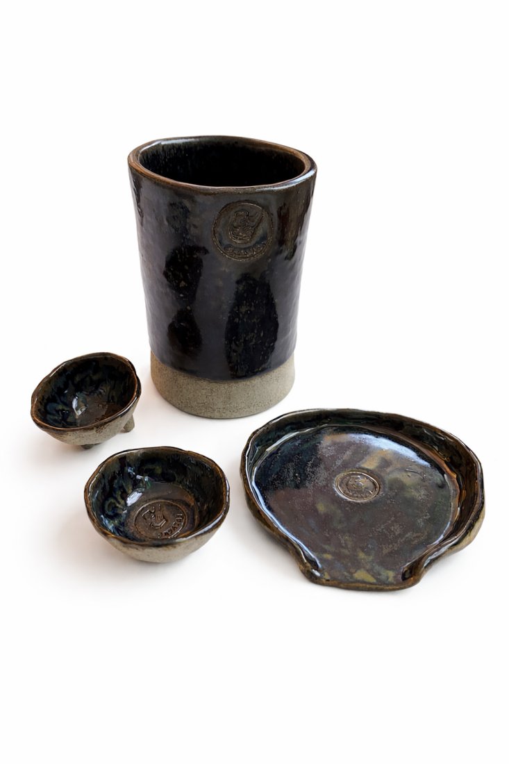 Ręcznie wykonany ceramiczny zestaw naczyń w głębokim czarnym kolorze z subtelnymi refleksami, które zmieniają się w zależności od światła. W skład zestawu wchodzą: kubek, dwie miseczki oraz talerzyk/podstawka. Idealny do codziennego użytku, serwowania drobnych przekąsek lub jako dekoracyjny zestaw ceramiczny. Każdy element jest unikatowy