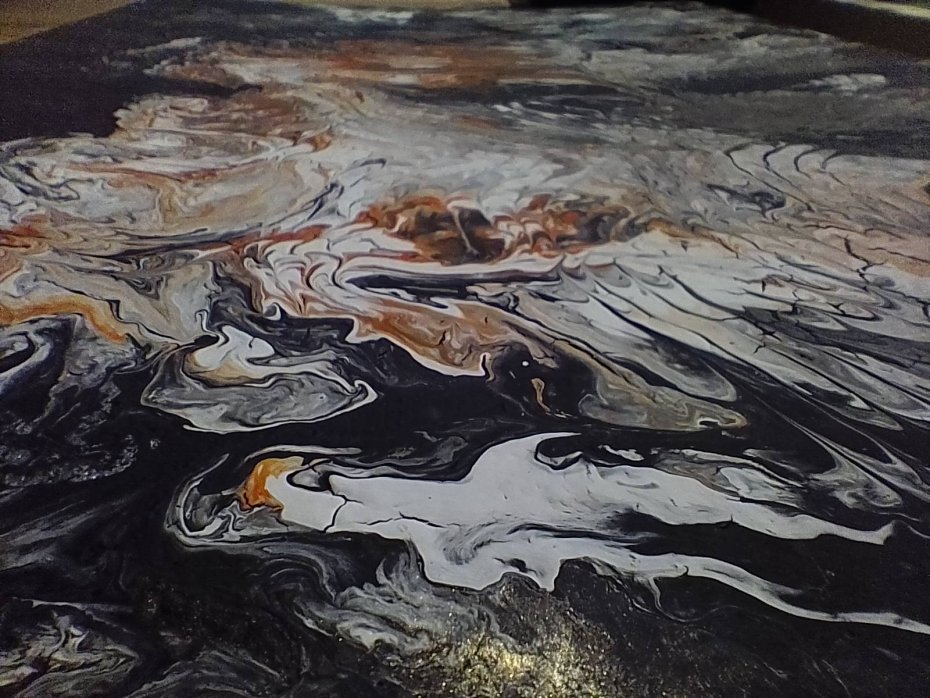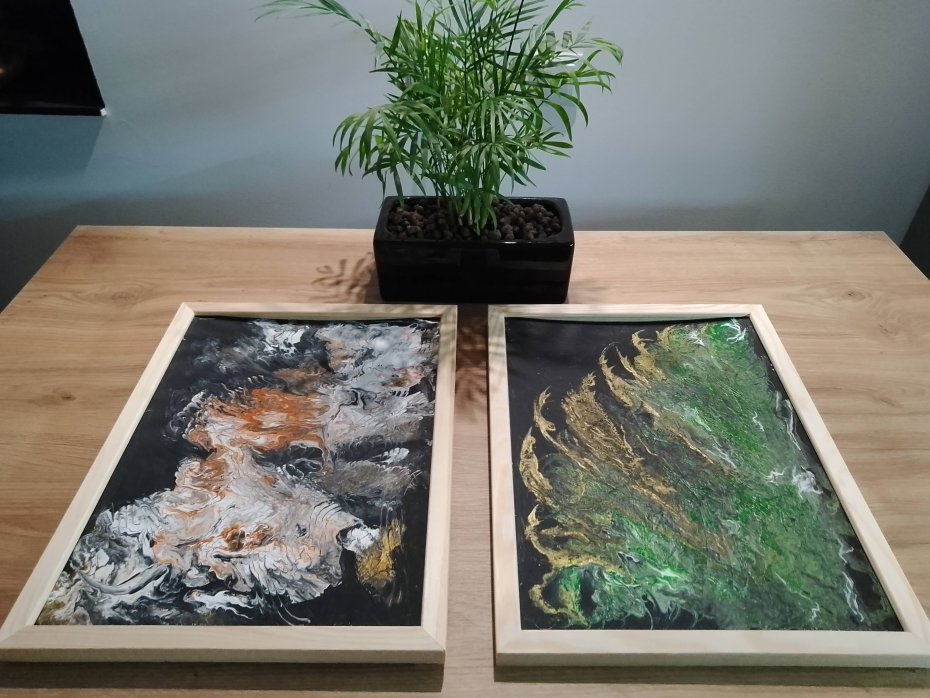 Obrazy wykonane metodą pouring są bardziej sztywne (duża ilość farby zużyta do ich wykonania), miejscami strukturalne (widoczne rzeźby, rysy, pęknięcia), podłoże jest nieco wygięte i poplamione farbą od spodu, ale po włożeniu do ramy się naprostuje a tył nie będzie widoczny. Wszystkie cechy czynią te obrazy bardziej oryginalnymi, niepowtarzalnymi i pozytywnie podkręcają efekt wizualny dekoracji.