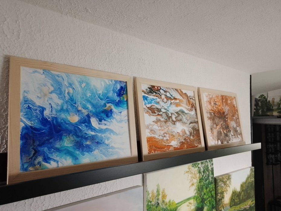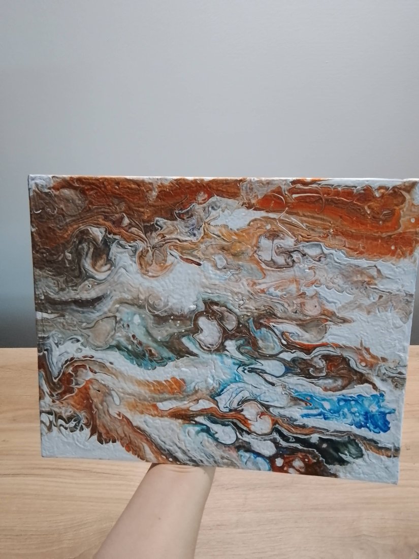 Obrazy wykonane metodą pouring są bardziej sztywne (duża ilość farby zużyta do ich wykonania), miejscami strukturalne (widoczne rzeźby, rysy, pęknięcia), podłoże jest nieco wygięte i poplamione farbą od spodu, ale po włożeniu do ramy się naprostuje a tył nie będzie widoczny. Wszystkie cechy czynią te obrazy bardziej oryginalnymi, niepowtarzalnymi i pozytywnie podkręcają efekt wizualny dekoracji.