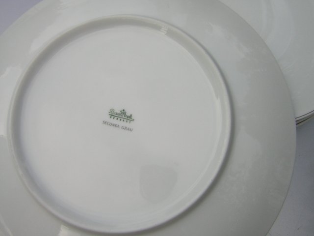 Zestaw czterech Talerzy obiadowych / średnica 25 cm/ sygnowanych ROSENTHAL SECUNDA GRAU. Szlachetna, mocna, dźwięczna porcelana. Uroda minimalizmu - biel szkliwionej na błyszcząco porcelany i subtelny satynowy szary paseczek dookoła. Ponadczasowa uroda i klasa. Pasuje do klasycznego wnętrza, ale też w nowoczesnym urodą swą autentyczności i klasy doda.