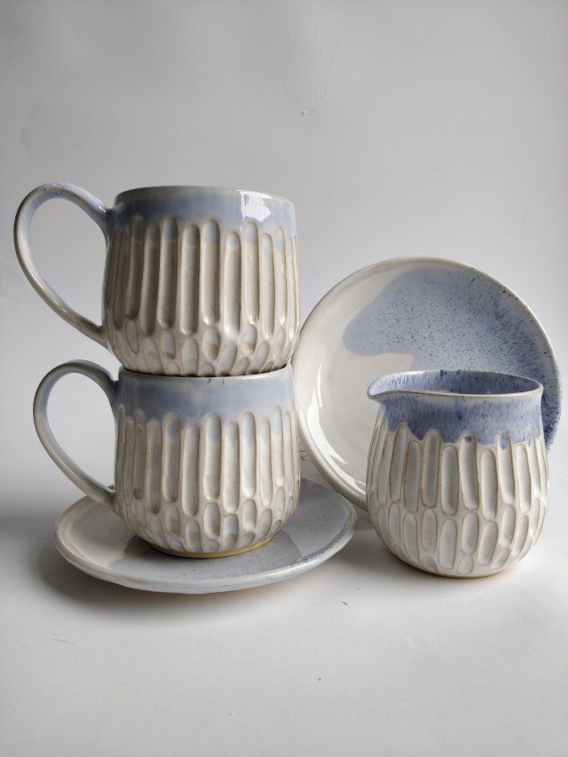 Zestaw z dwóch dużych filiżanek ze spodkami i dzbanuszkiem toczonych na kole garncarskim. Pokryte białym i niebieskim szkliwem spożywczym. Każdy z elementów jest jedyny w swoim rodzaju i niepowtarzalny.
