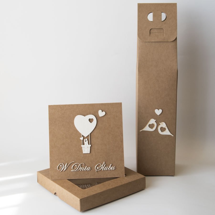 Zestaw został wykonany na bazie ekologicznego brązowego papieru. Dzięki niemu nie musisz się już zastanawiać, aby skompletować pasujące do siebie elementy prezentu ślubnego.