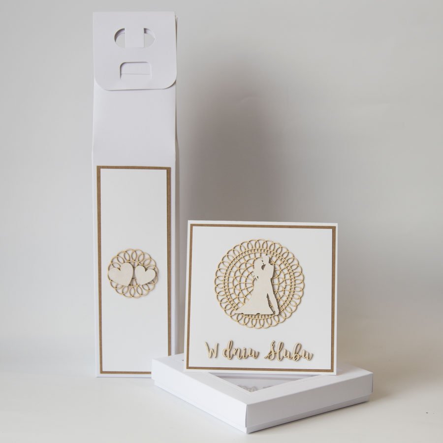 Zestaw został wykonany na bazie białego papieru. Dzięki niemu nie musisz się już zastanawiać, aby skompletować pasujące do siebie elementy prezentu ślubnego.