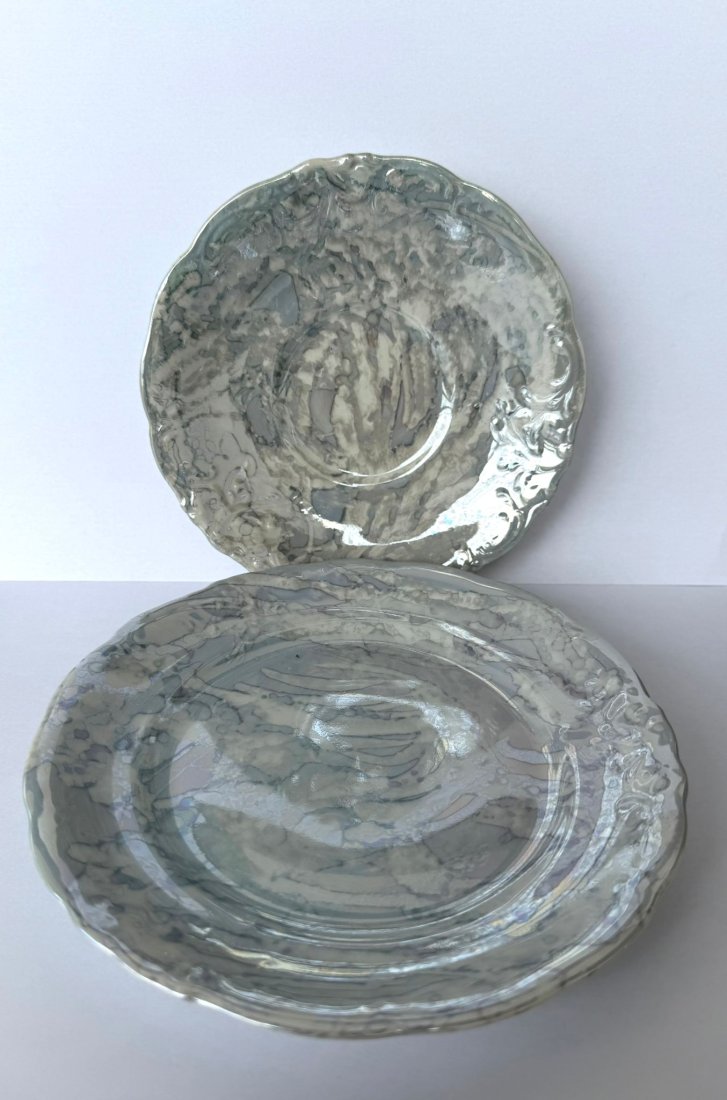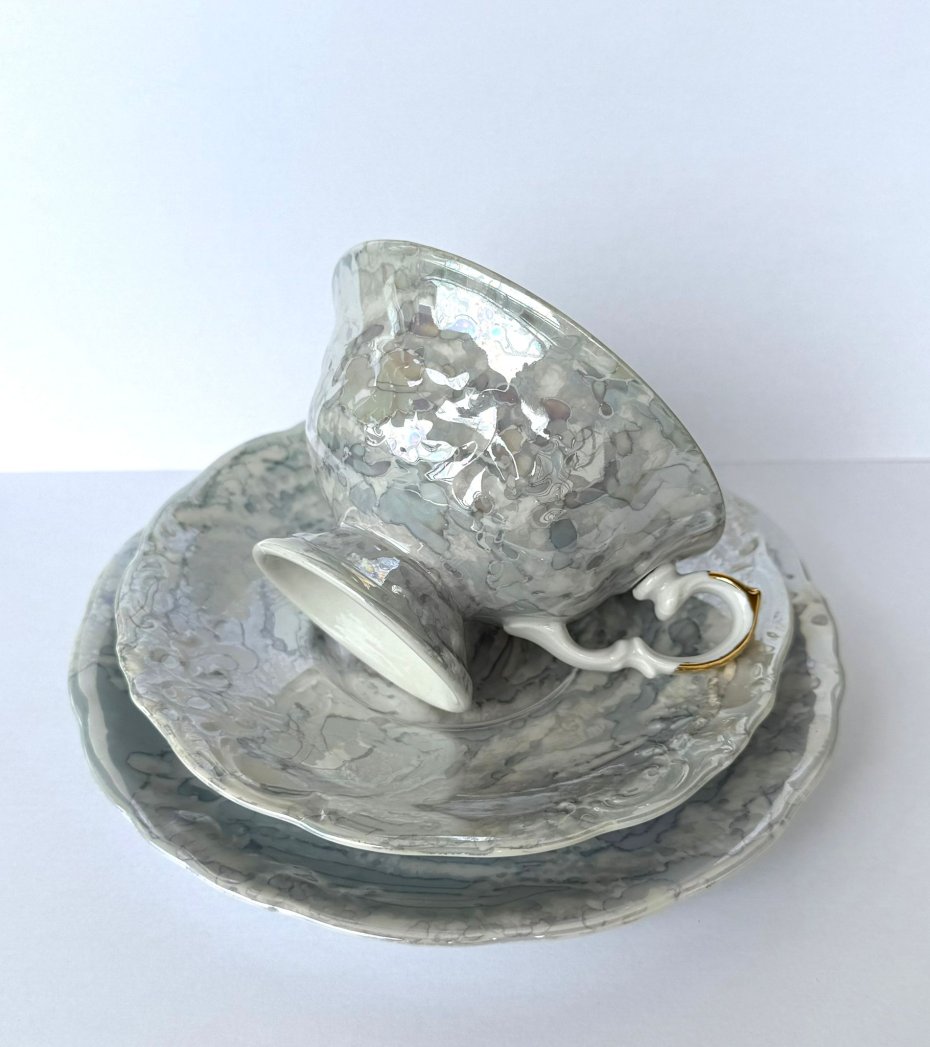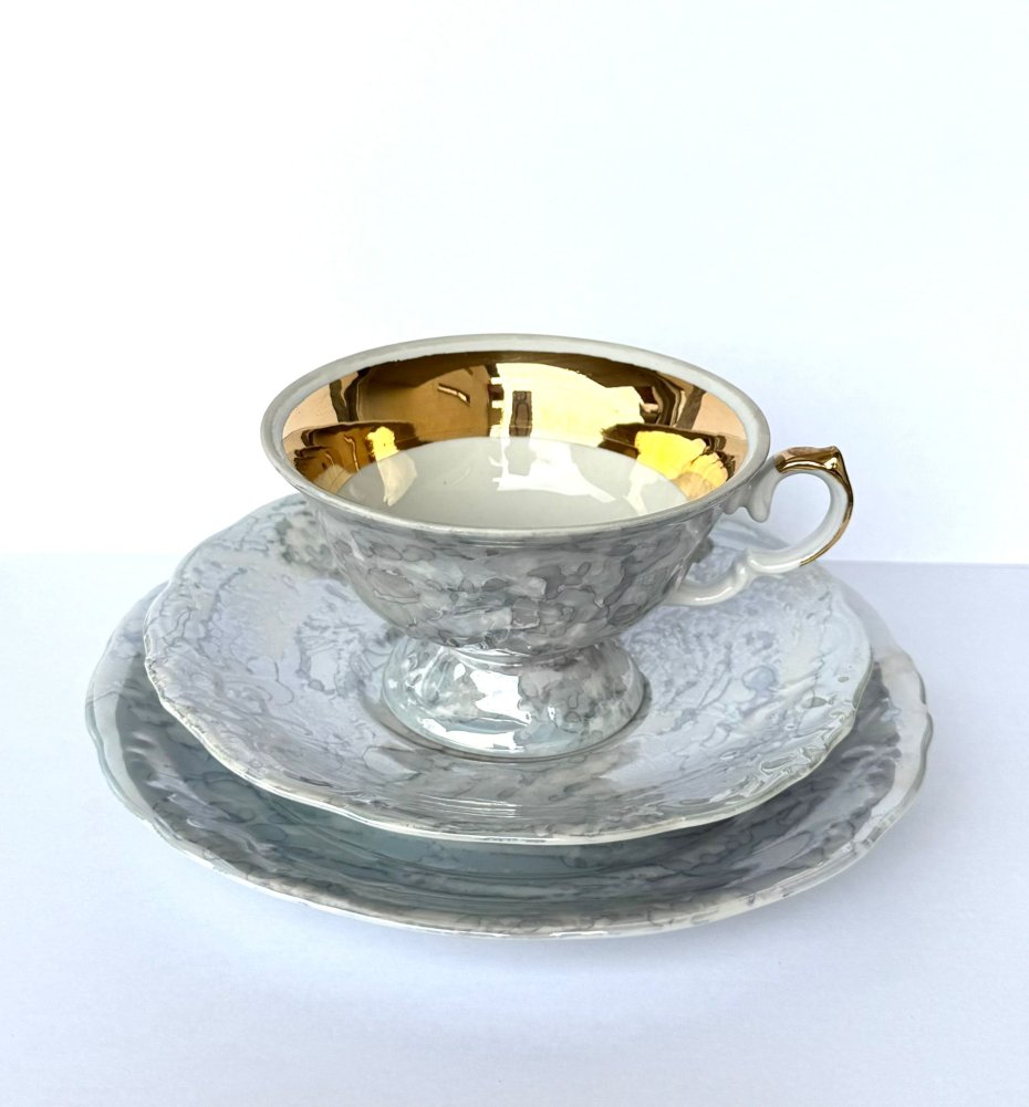 Mam do sprzedania świetne trio z wałbrzyskiej wytwórni Wawel, pochodzące z lat 60. lub 70 XX wieku. Zestaw od razu rzuca się w oczy dzięki rzadko spotykanej malaturze w szary marmurek, która w połączeniu z bogatym złoceniem robi niesamowite wrażenie.