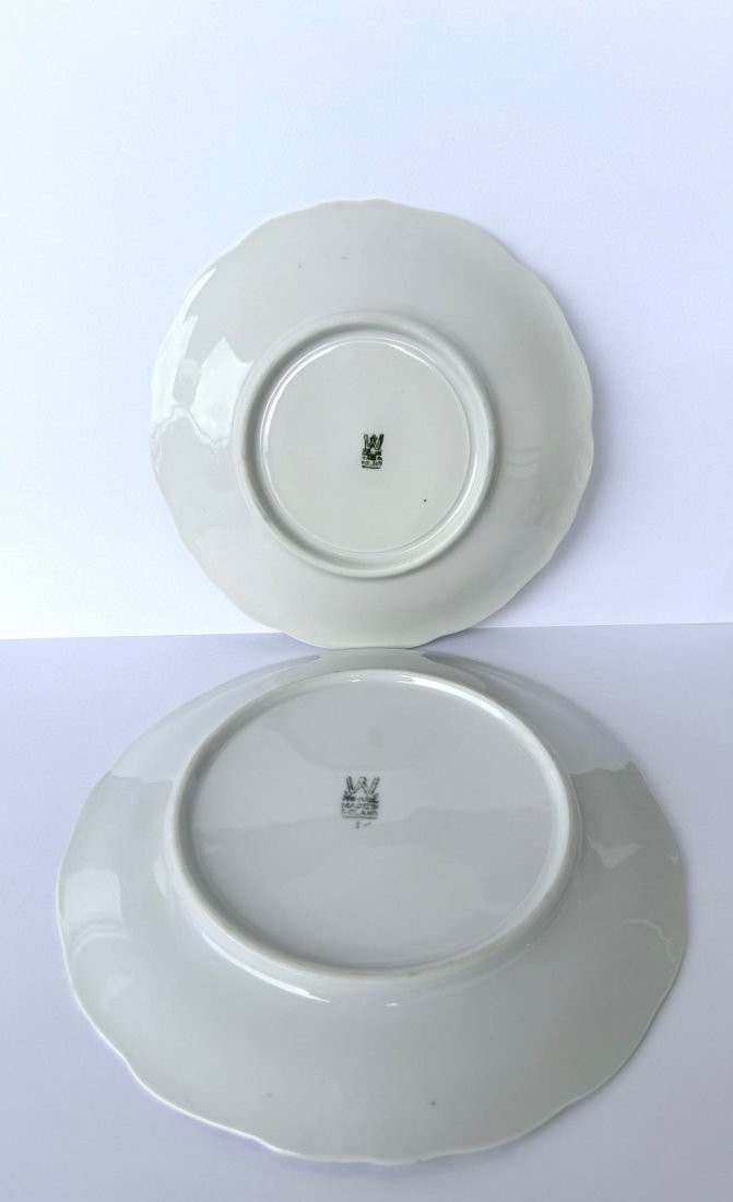 Całość zachowana w naprawdę bardzo dobrym stanie, porcelana nie ma żadnych wyszczerbień czy pęknięć, a złoto wewnątrz filiżanki wciąż mocno błyszczy. W skład zestawu wchodzi filiżanka o wysokości około 6,1 cm, spodek średnica ok 15 cm oraz talerzyk deserowy o średnicy około 17 cm.
