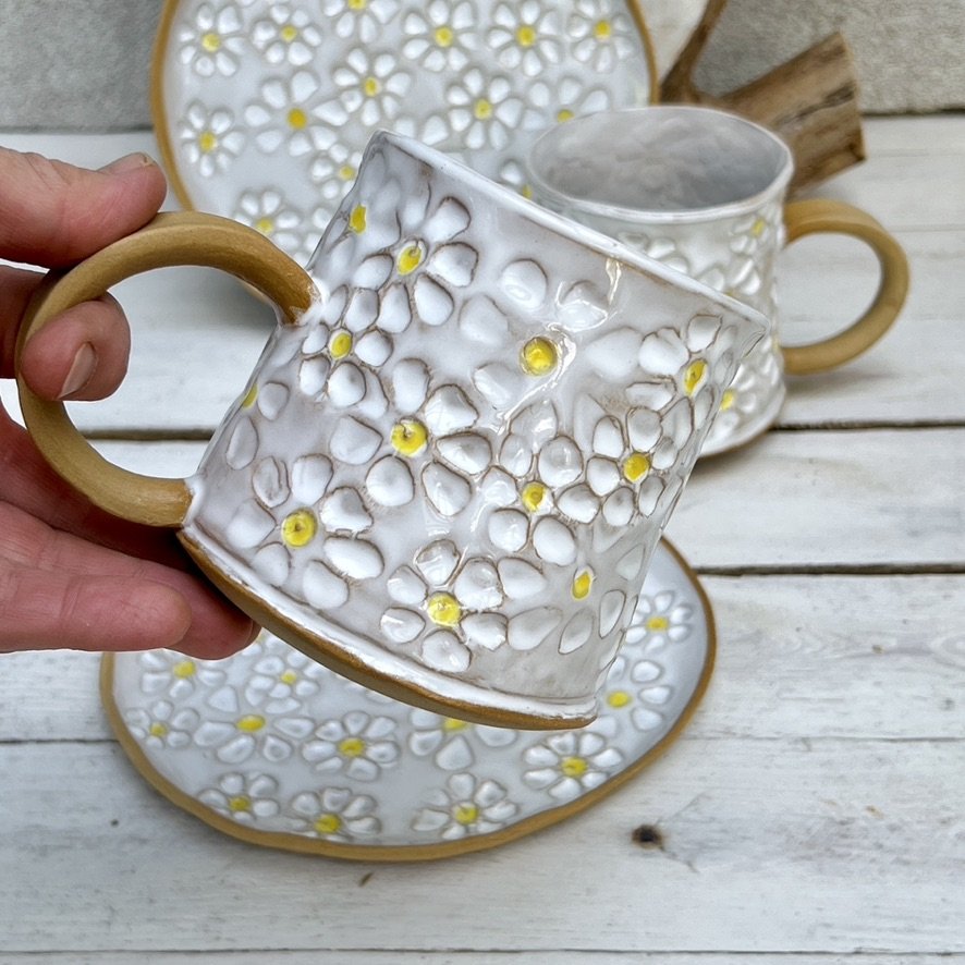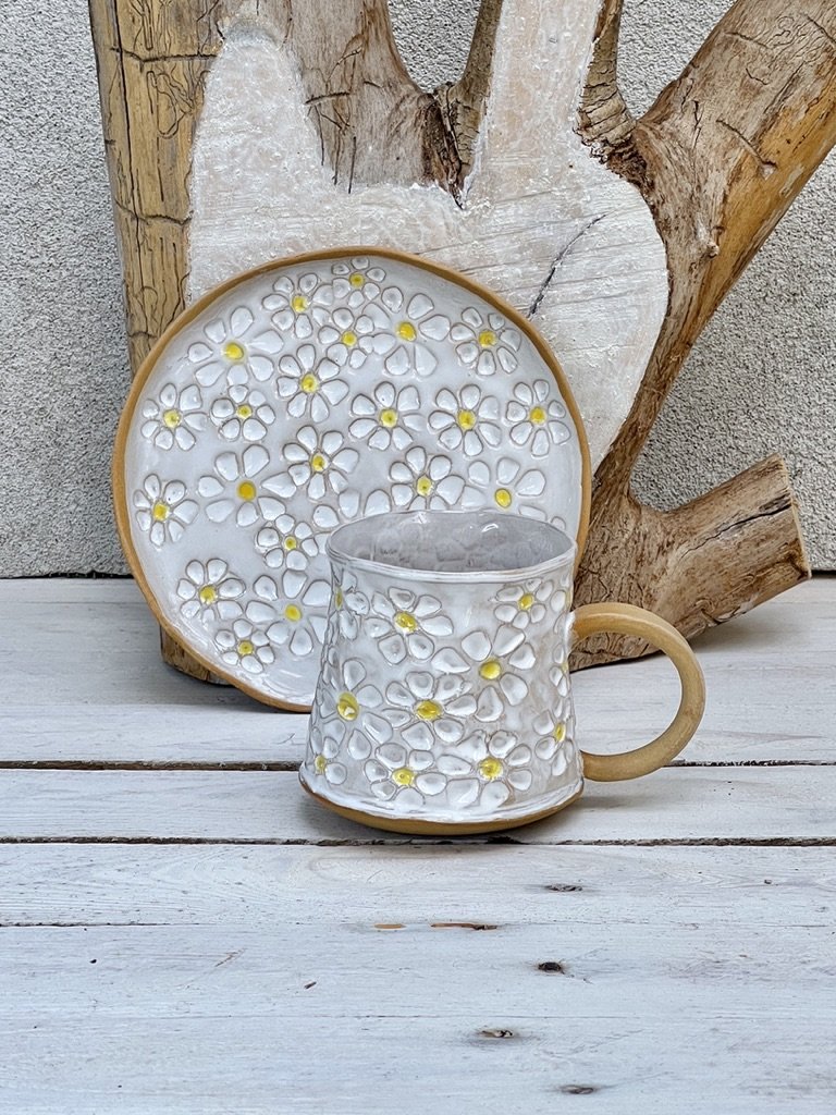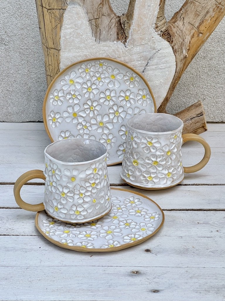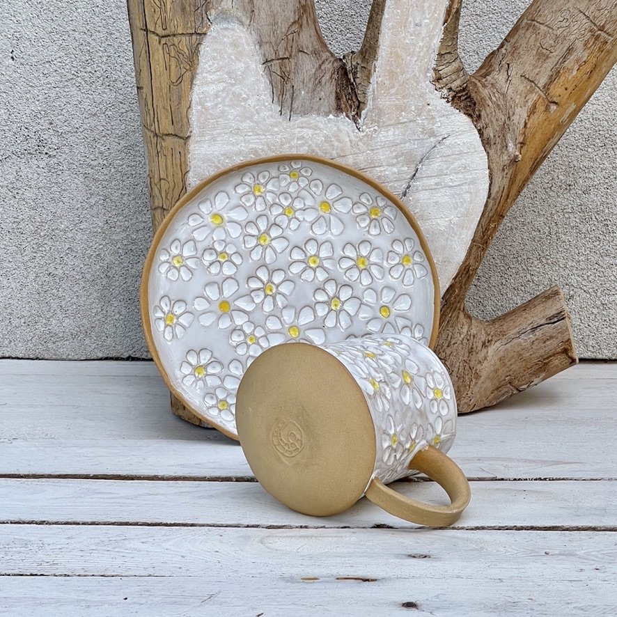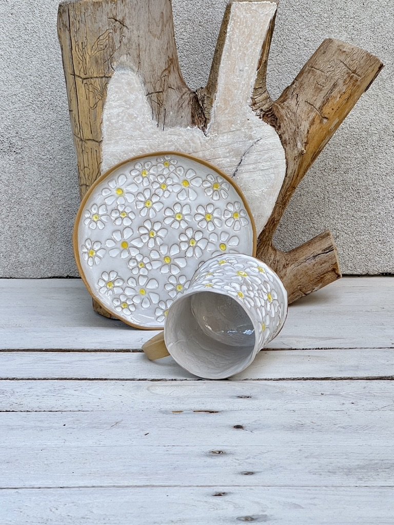 Ręcznie wykonany zestaw śniadaniowy z wytłoczonym motywem kwiatowym białych anemonów z żółtymi środkami. Ten wyjątkowy komplet składa się z dużego kubka do kawy lub herbaty oraz płaskiego okrągłego talerza na tost, ciasto lub sałatkę. Naczynia nadają się do mycia w zmywarce, ale polecam mycie ręczne.