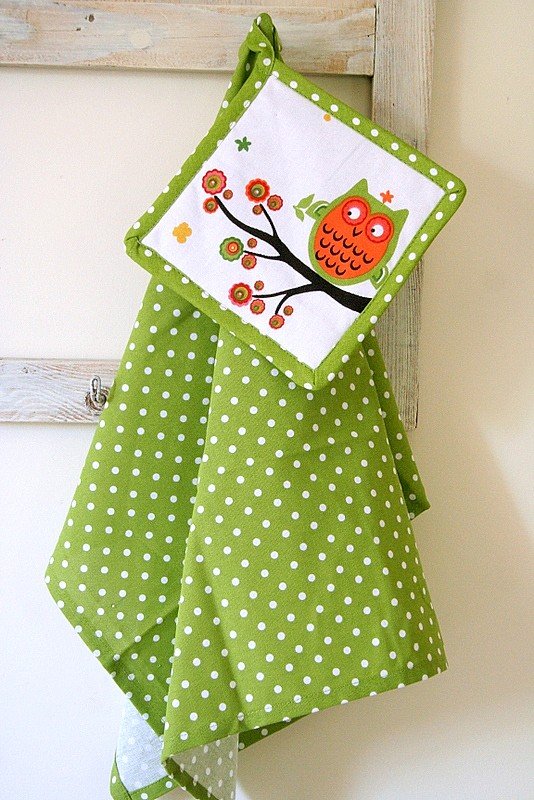 Uroczy zestaw kuchennych, bawełnianych tekstyliów...w postaci łapki / podkładki pod garnek z sympatyczną sówką oraz zielonej ściereczki w białe kropeczki.