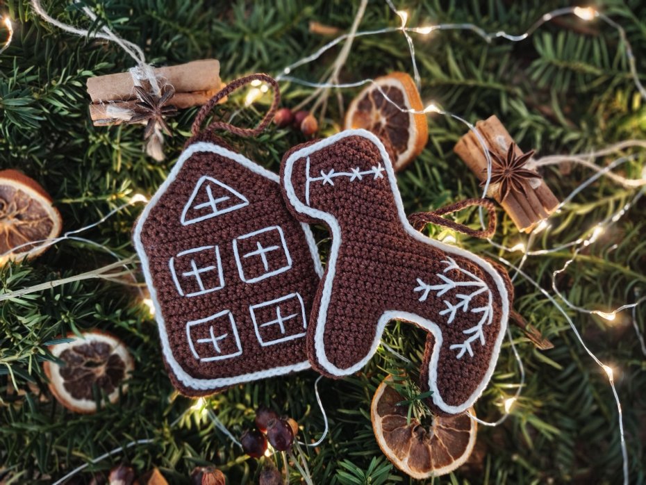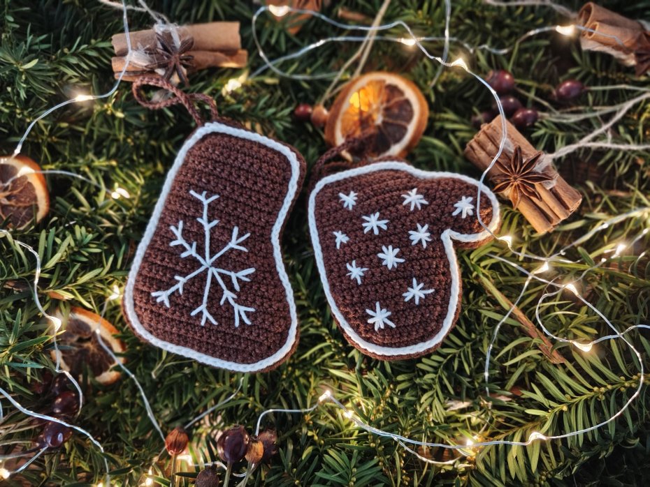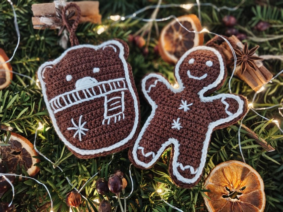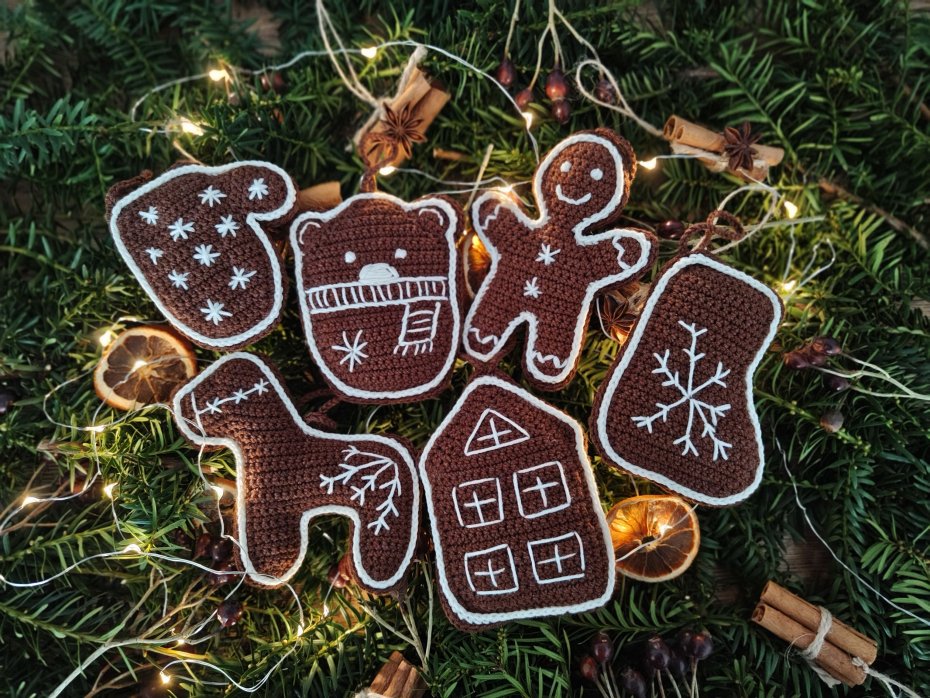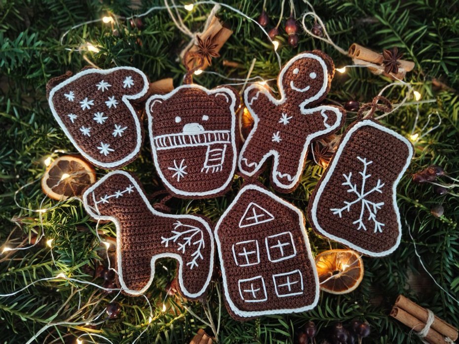 Sześć szydełkowych zawieszek w kształcie pierniczków to niepowtarzalna dekoracja każdej choinki.