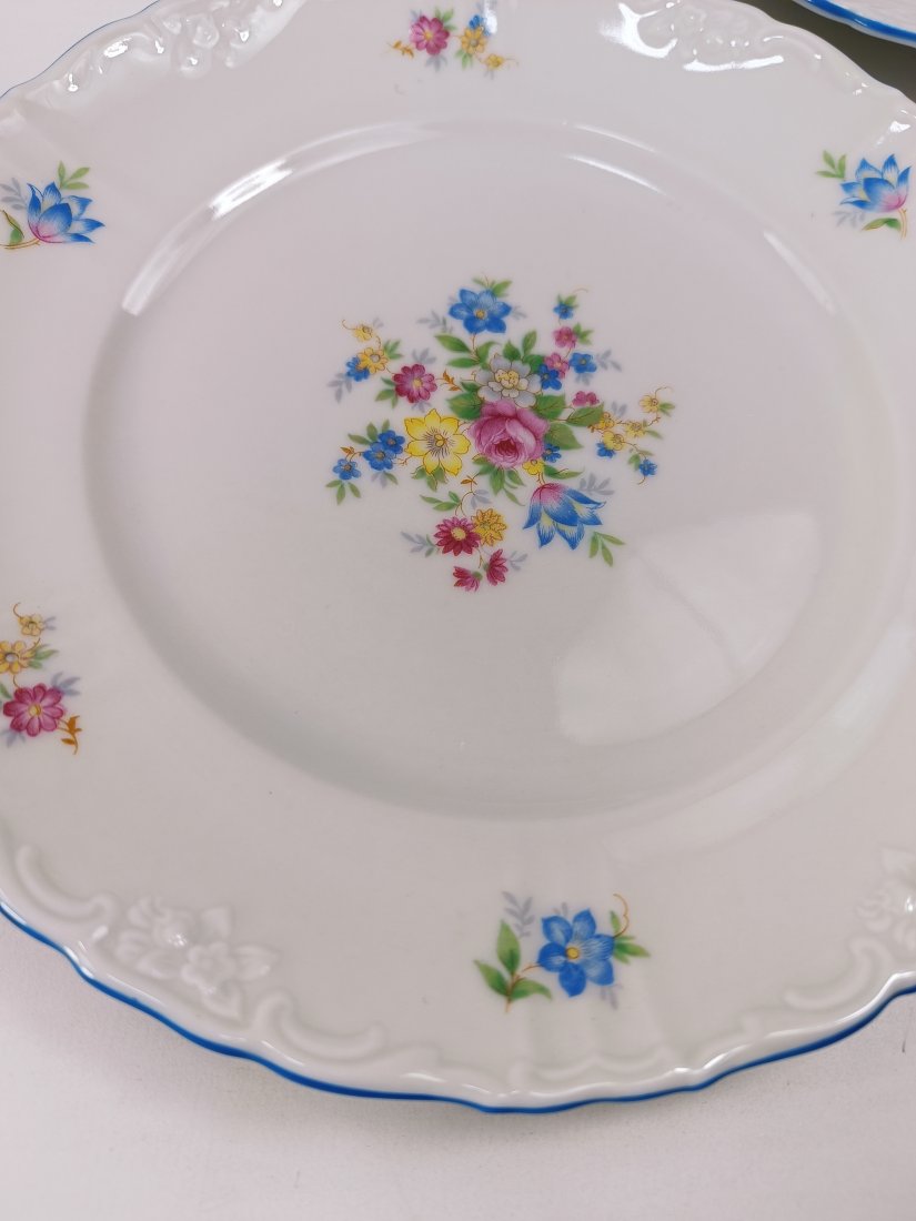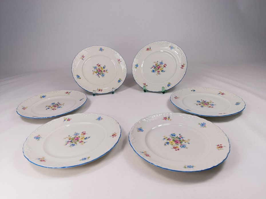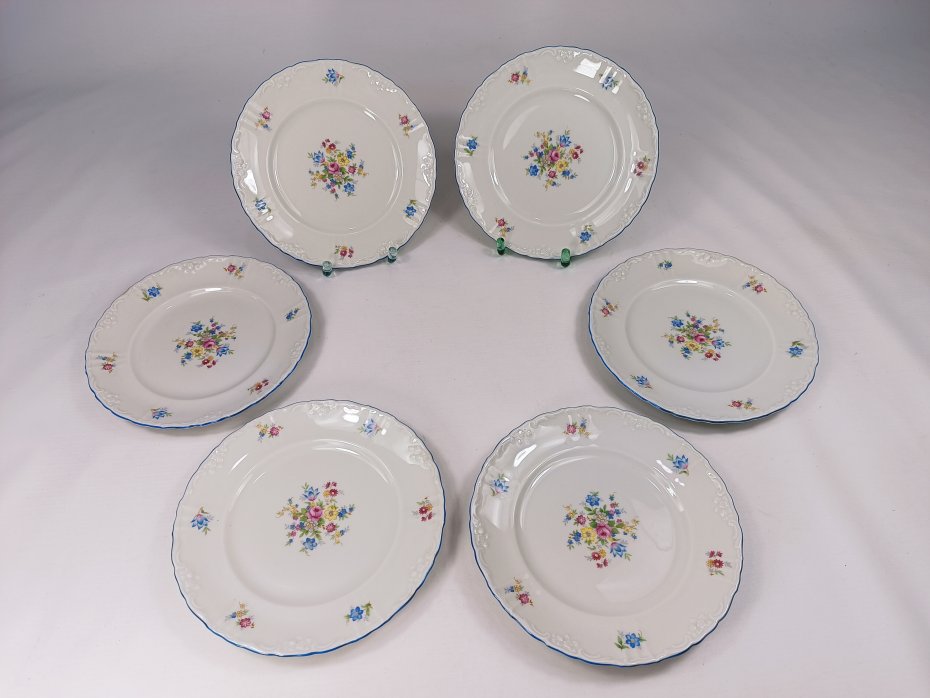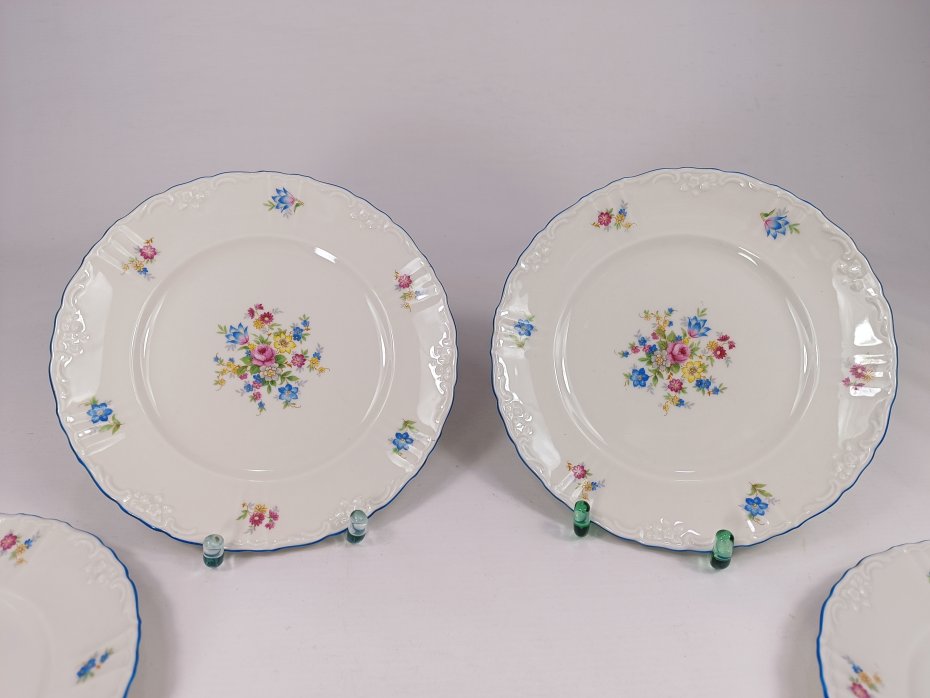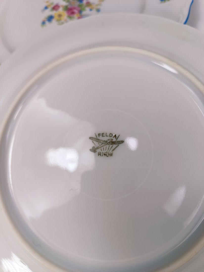 Zestaw talerzy deserowych Felda Rohn, Art Deco z lat 30. Stan zachowania bardzo dobry. Średnica 19 cm. Na innych ogłoszeniach mam więcej naczyń z kompletu.