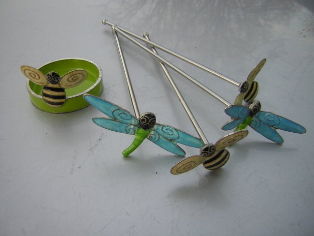 Zestaw emaliowanych mieszadełek do drinków i pojemniczka, podstawki. Urocze pszczółki i ważki. Emaliowane obustronnie. Kolory żywe, radosne, wykończenie satynowo - błyszczące. Złote ranty i niteczki obramowania wzoru. Same patyczki chromowane z kulką na końcu. Pojemnik średnica 5,5 cm wysokość z pszczółką 3,5 podstawa 1 cm. Mieszadła dł. Samego patyczka 17 cm , pszczółki 4,5 x 2,5 ważki około 7 x 3 cm