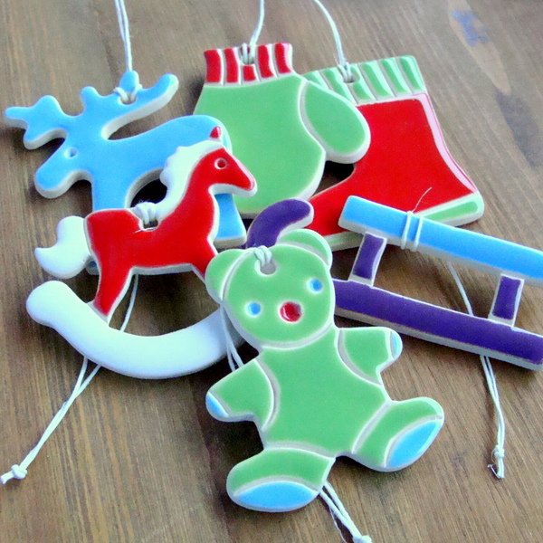 Zestaw 6 ceramicznych, kolorowych zawieszek świątecznych. Ozdobnie opakowane. Wymiary ozdób - ok. 6-7 cm. Polecam serdecznie.