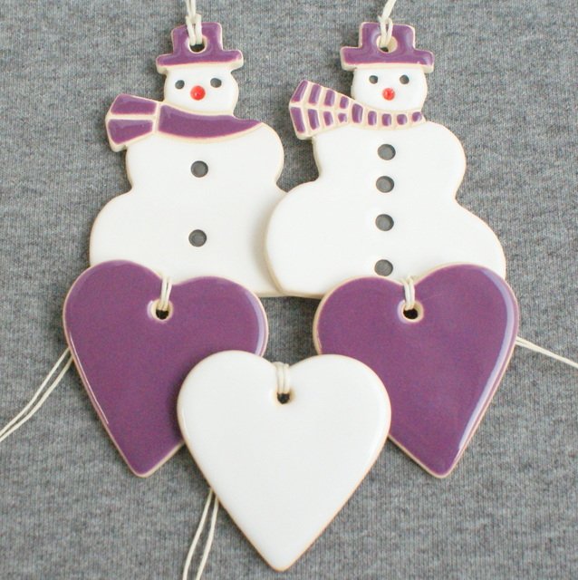 Zestaw 5 ceramicznych zawieszek. Doskonała świąteczna ozdoba choinki, stroika albo paczki z prezentem. Ozdoby wykonane z białej gliny, pokryte przepięknymi błyszczącymi szkliwami w kolorze fioletowym i białym. Zawieszki ozdobnie opakowane w pudełko. Wymiary - ok. 5-7 cm. Polecam.