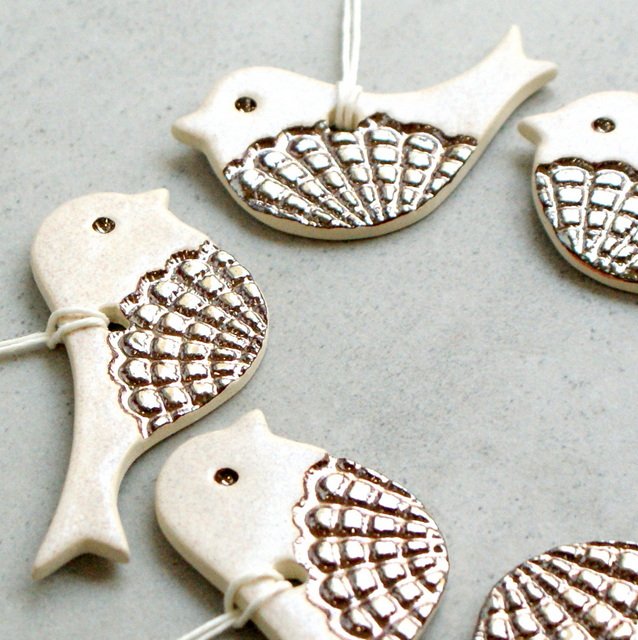 Zestaw 6 ceramicznych ptaszków - zawieszek. Doskonała świąteczna ozdoba choinki, stroika albo paczki z prezentem. Pokryte szkliwami: bardzo błyszczącym w kolorze starego złota i perłowym białym z efektem złotych drobinek. Zawieszki ozdobnie zapakowane w pudełko. Długość ptaszków - od 6 do 7,5 cm. Polecam.