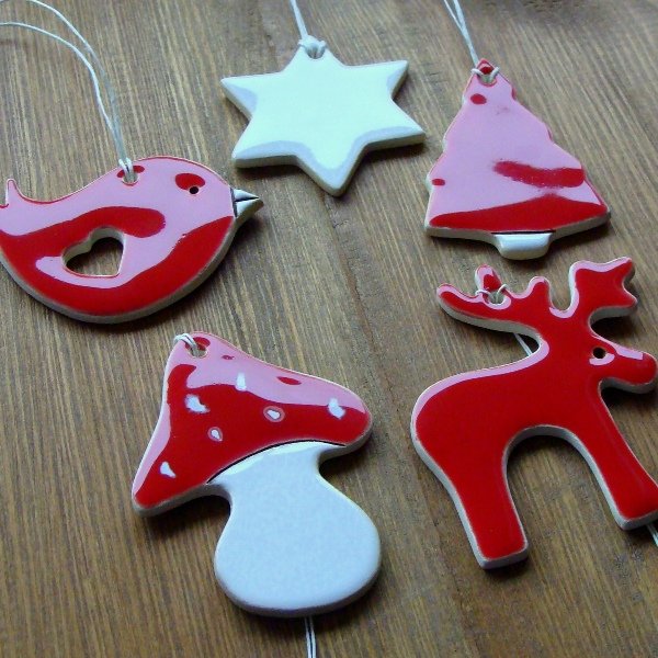 Zestaw 5 zawieszek ceramicznych w postaci renifera, muchomorka, ptaszka, gwiazdki i choinki. Wykonane z jasnej gliny pokryte błyszczącymi szkliwami białym i czerwonym. Wymary: renifer - ok. 7,5 x 6 cm, muchomorek - ok. 8 x 5,5 cm, ptaszek - ok. 7 x 5 cm, gwiazdka - ok. 5,5 cm, choinka - ok. 6,5 x 4,5 cm. Pięknie zapakowane. Polecam serdecznie.