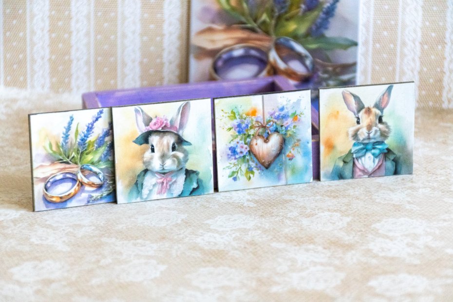 Znajdziesz w nim 4 magnesy o motywie miłosnym - jest para króliczków, obrączki i drewniane serce