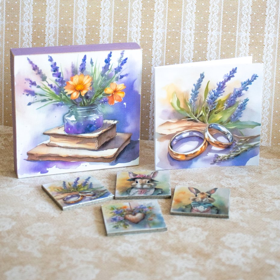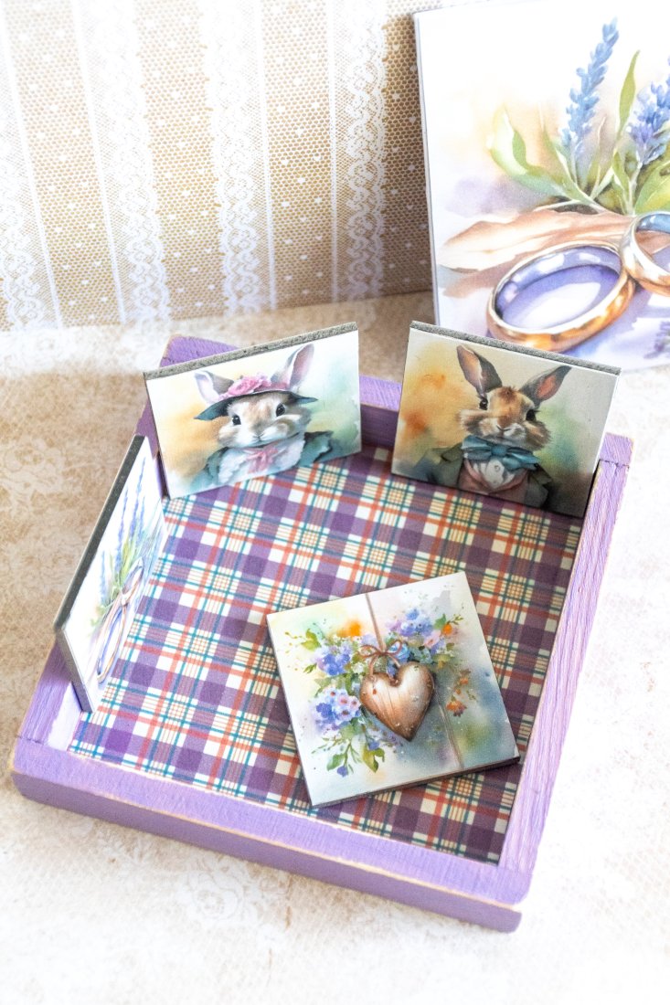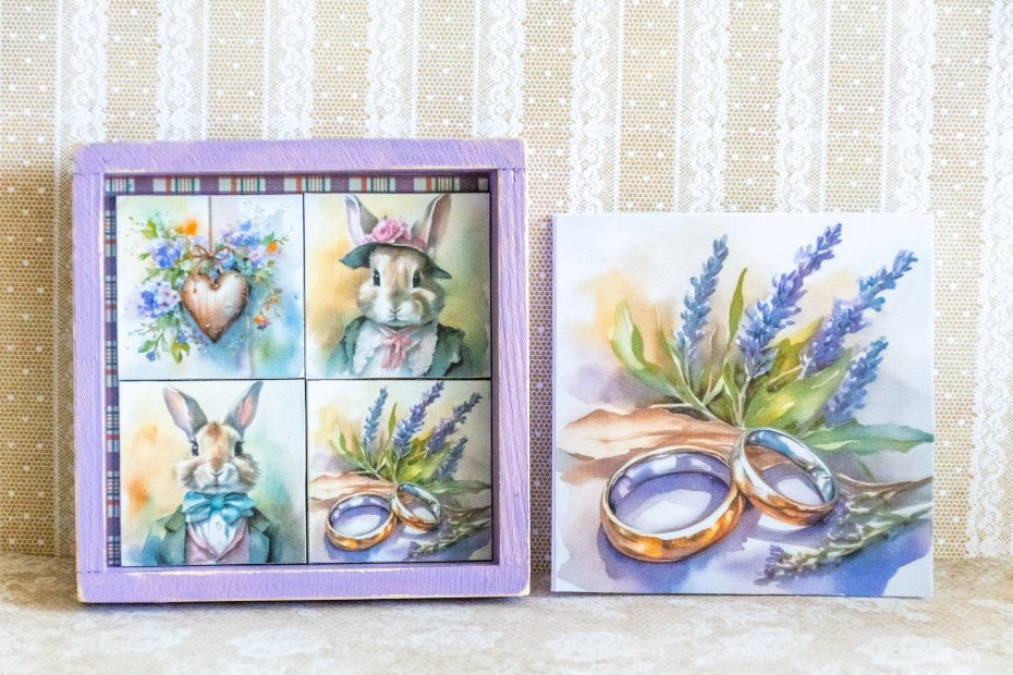 W tym samym zestawie mamy też otwarte pudełko drewniane, które po obróceniu staje się małym obrazkiem do postawienia lub do powieszenia, jakby dodać mu zawieszkę