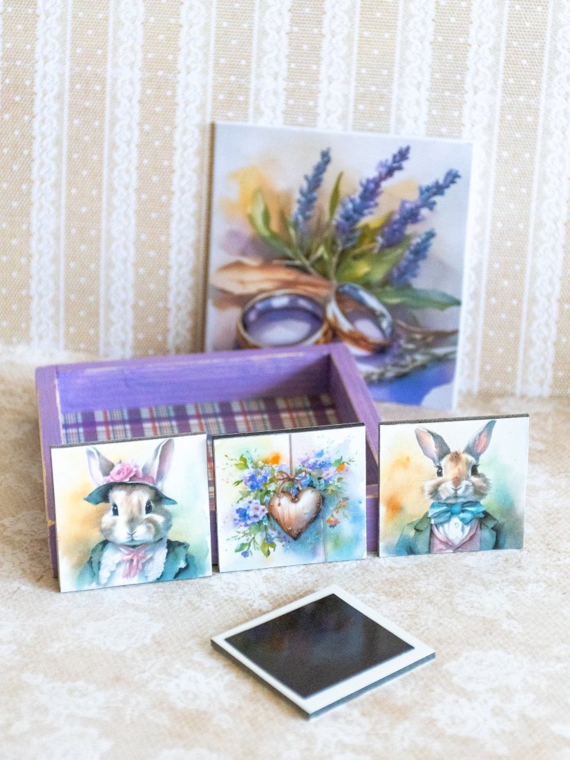 Pudełko oraz przody magnesów są ozdobione metodą decoupage, zostały też pokryte lakierem akrylowym