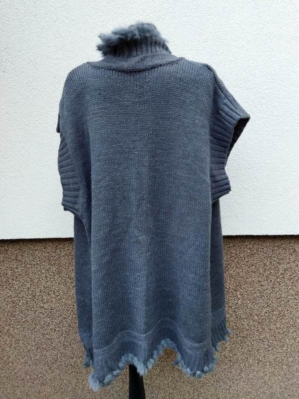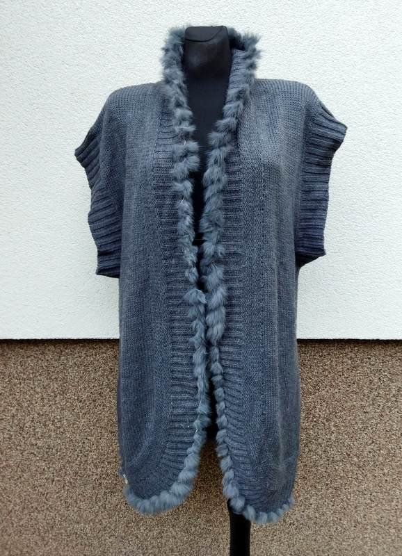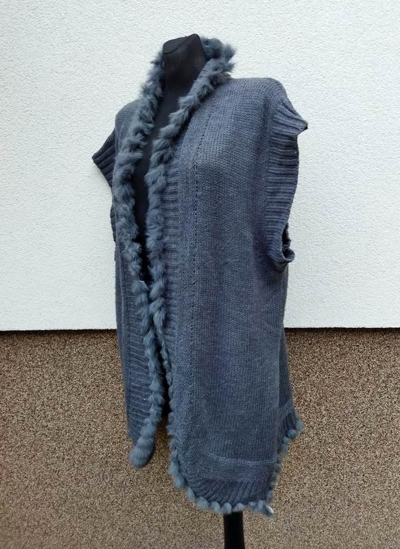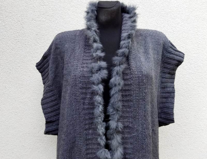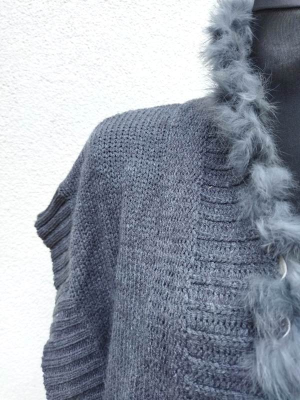 Dłuższa kamizelka z akrylowej włóczki w szarym kolorze, brzegi przeplatane króliczym futerkiem w identycznym kolorze. Fason otwarty z kołnierzem przechodzącym w plisę wokół brzegów swetra .
