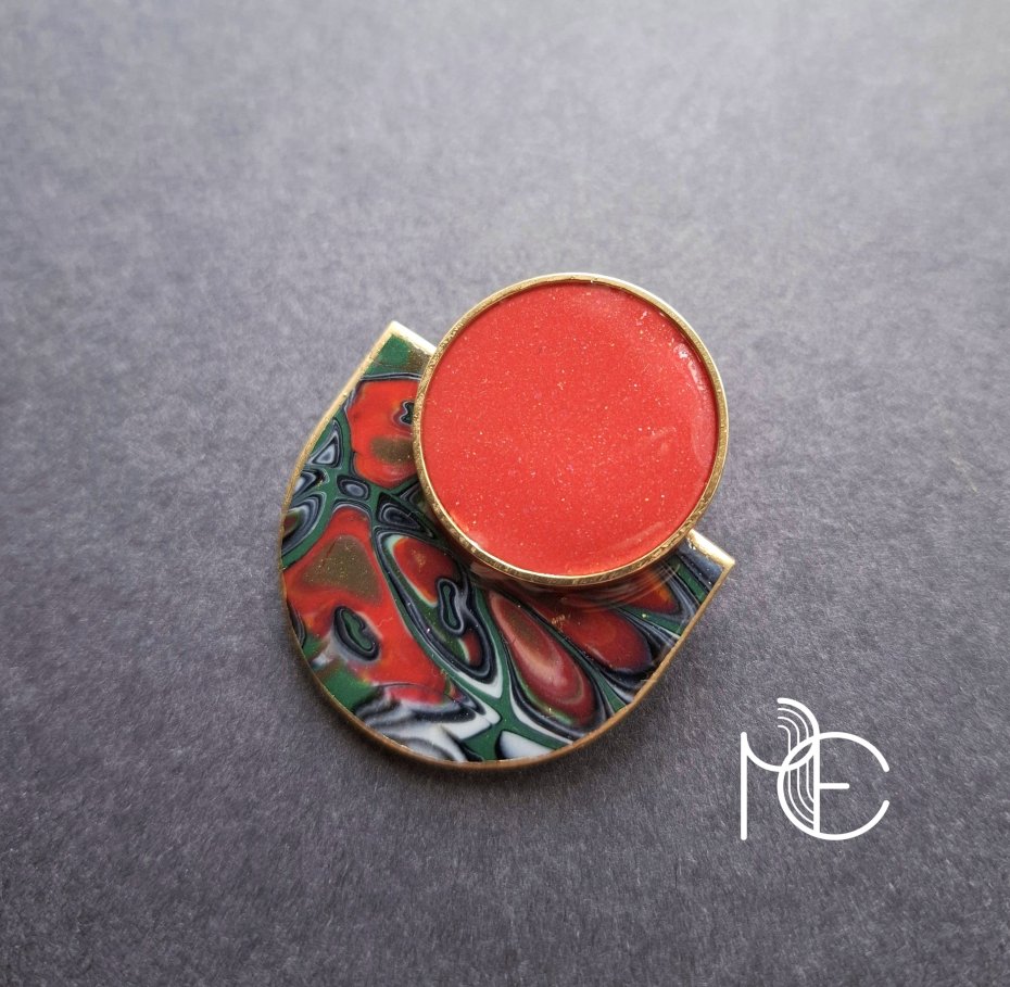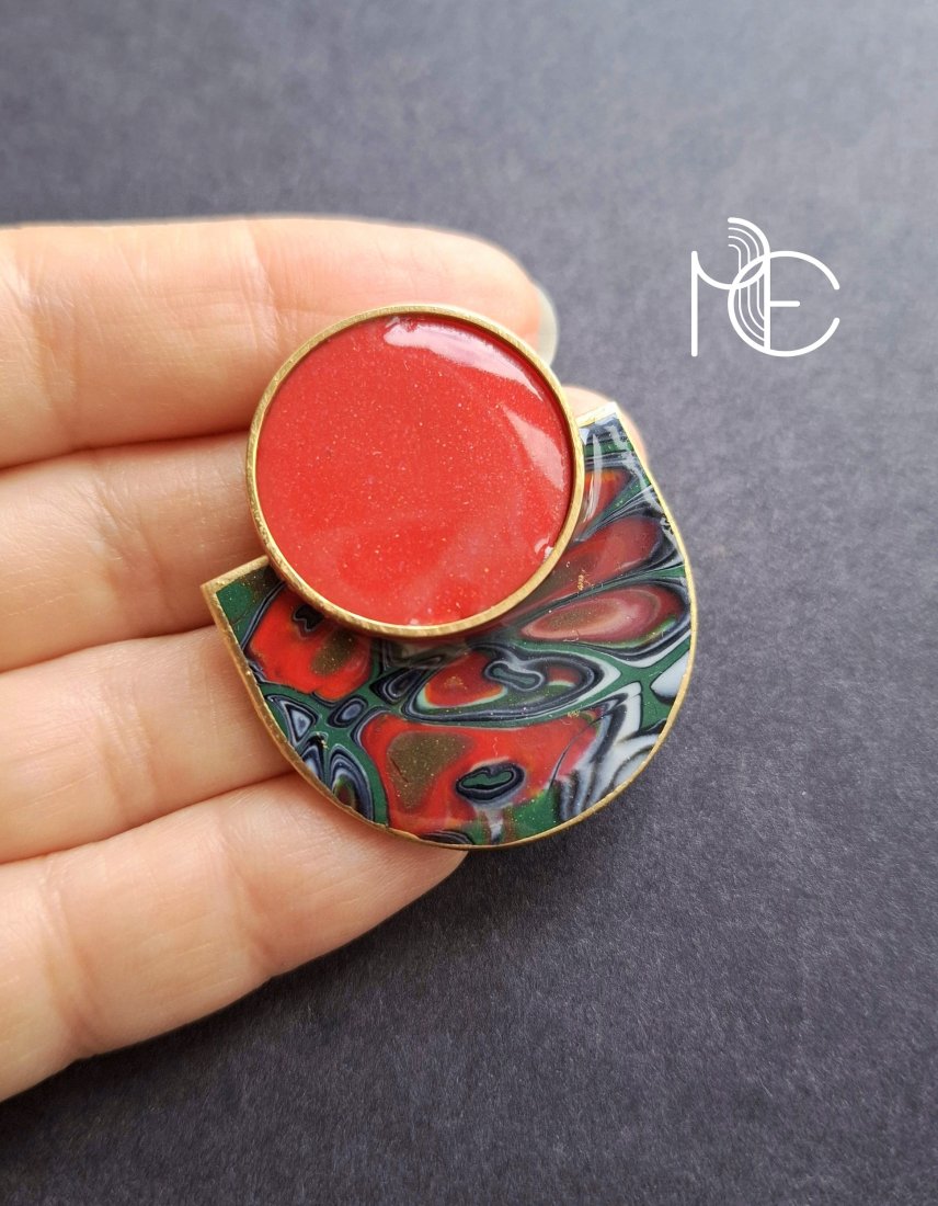 Kolczyki na sztyfty wykonane z wysokiej jakości glinki polimerowej z dodatkiem ozdobnych elementów metalowych. Jednostronne z pozłacanymi, nieuczulającymi sztyftami. Wymiary: długość wraz z zapięciem: 4,2 cm; szerokość max. 3,5 cm.