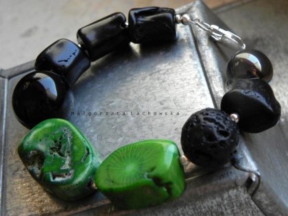 Dość masywna bransoleta wykonana z korala (25-16 mm), kuli onyksu (20 mm), lawy wulkanicznej (16 mm) i hematytu (14 mm). Wykończenie w srebrze póby 925. Długość bransoletki wynosi 20,5 cm.