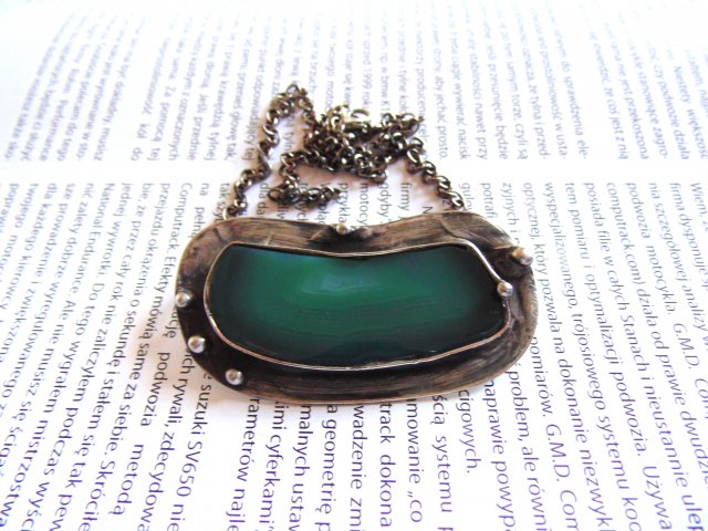 Wisiorek wykonany z miedzi, cyny i agatu. Wymiary ok. 3,5 na 6,5 cm. Łańcuszek o długości ok. 50 cm.