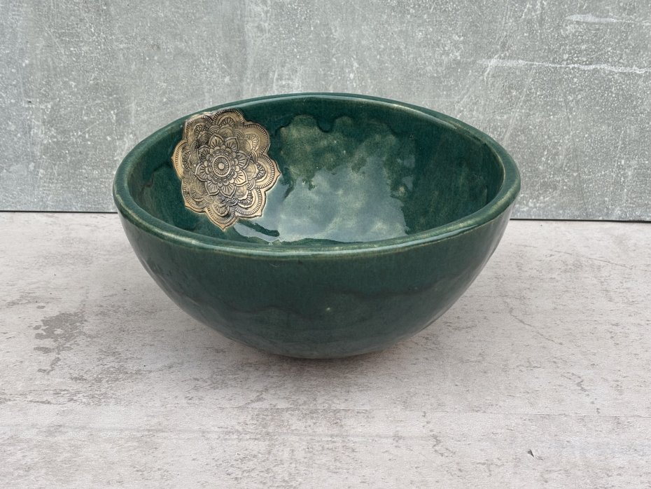 Unikalna, ręcznie wykonana umywalka ceramiczna w głębokim, szmaragdowym odcieniu zieleni. Jej minimalistyczna forma została przełamana subtelnym, dekoracyjnym elementem w kształcie mandali w czarnym kolorze, co nadaje jej elegancki i artystyczny charakter.
